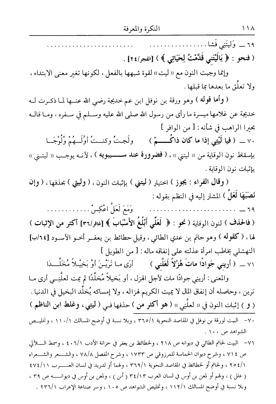 70- البيت لورقة بن نوفل في المقاصد النحوية 1/ 365، وبلا نسبة في أوضح المسالك 1/ 110، وتخليص الشواهد ص100.