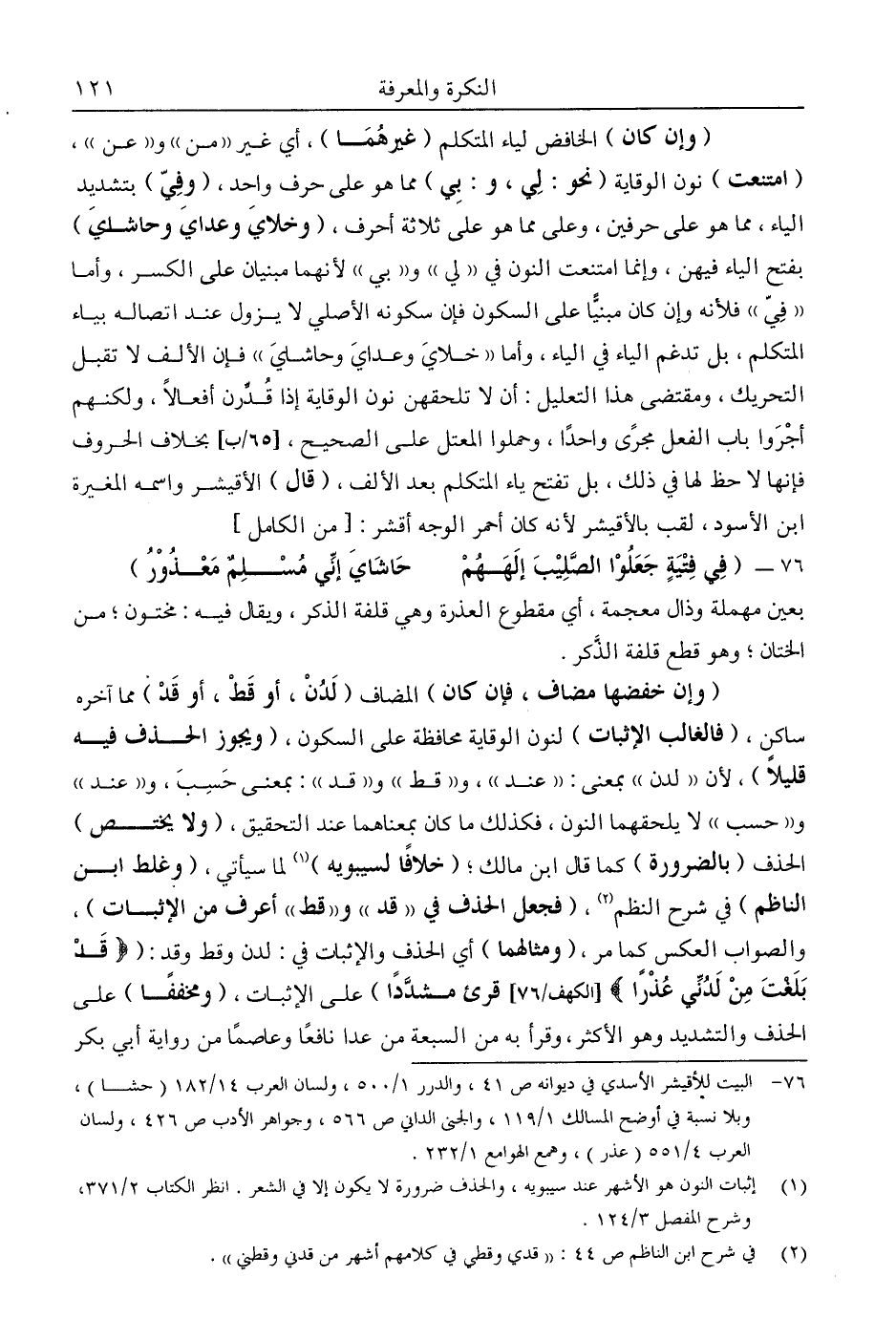 1 إثبات النون هو الأشهر عند سيبويه، والحذف ضرورة لا يكون إلا في الشعر. انظر الكتاب 2/ 371، وشرح المفصل 3/ 124.