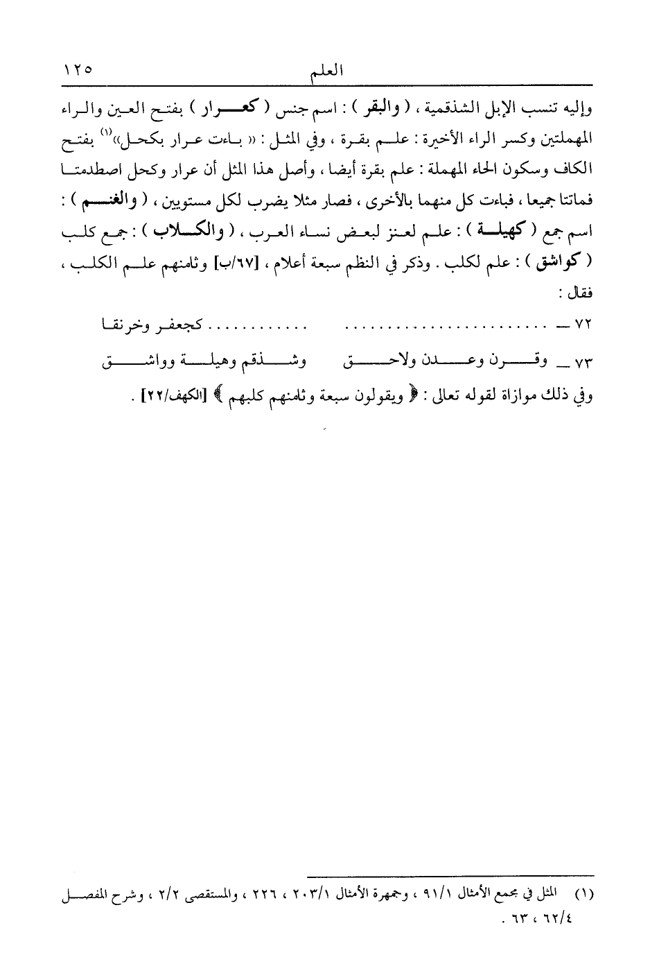 وإليه تنسب الإبل الشذقمية، "والبقر": اسم جنس "كعرار" بفتح العين والراء المهملتين وكسر الراء الأخيرة: علم بقرة، وفي المثل: "باءت عرار بكحل"1 بفتح الكاف وسكون الحاء المهملة: علم بقرة أيضا، وأصل هذا المثل أن عرار وكحل اصطدمتا فماتتا جميعا، فباءت كل منهما بالأخرى، فصار مثلا يضرب لكل مستويين، "والغنم": اسم جمع "كهيلة": علم لعنز لبعض نساء العرب، "والكلاب": جمع كلب "كواشق": علم لكلب. وذكر في النظم سبعة أعلام، وثامنهم علم الكلب، فقال: