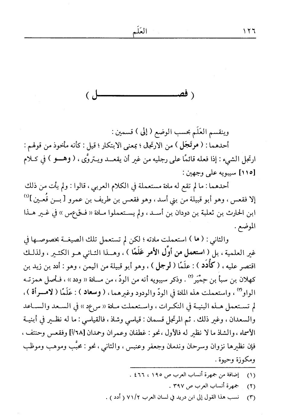 والثاني: "ما" استعملت مادته؛ لكن لم تستعمل تلك الصيغة بخصوصها في غير العلمية، بل "استعمل من أول الأمر علما"، وهذا الثاني هو الكثير، ولذلك اقتصر عليه، "كأدد": علما "لرجل"، وهو أبو قبيلة من اليمن، وهو: أدد بن زيد بن كهلان بن سبأ بن حمير2. وذكر سيبويه أنه من الود، من مادة "ودد"، فأصل همزته الواو3، واستعملت هذه المادة في الود والودود وغيرهما، "وسعاد": علما "لامرأة"، لم تستعمل هذه البنية في النكرات، واستعملت مادة "س ع د" في السعد والساعد والسعدان، وغير ذلك. ثم المرتجل قسمان: قياسي وشاذ، فالقياسي: ما له نظير في أبنية الأسماء، والشاذ ما لا نظير له فالأول، نحو: غطفان وعمران وحمدان وفقعس وحنتف، فإن نظيرها نزوان وسرحان وندمان وجعفر وعنبس، والثاني، نحو: محبب وموهب وموظب ومكوزة وحيوة.