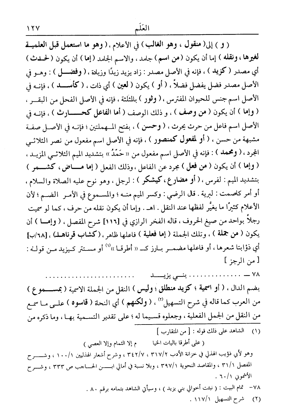 "و" إلى "منقول، وهو الغالب" في الأعلام، "وهو ما استعمل قبل العلمية لغيرها، ونقله" إما أن يكون "من اسم" جامد، والاسم الجامد "إما" أن يكون "لحدث" أي: مصدر "كزيد"، فإنه في الأصل مصدر: زاد يزيد زيدا وزيادة، "وفضل": وهو في الأصل مصدر فضل يفضل فضلا, "أو" يكون "لعين" أي: ذات, "كأسد", فإنه في الأصل اسم جنس للحيوان المفترس، "وثور" بالمثلثة، فإنه في الأصل الفحل من البقر، "وإما" أن يكون "من وصف"، وذلك الوصف "أما الفاعل كحارث"، فإنه في الأصل اسم فاعل من حرث يحرث، "وحسن" بفتح المهملتين؛ فإنه في الأصل صفة مشبهة من حسن، "أو لمفعول كمنصور"، فإنه في الأصل اسم مفعول من نصر الثلاثي المجرد، "ومحمد": فإنه في الأصل اسم مفعول من "حمد" بتشديد الميم الثلاثي المزيد، "وإما" أن يكون "من فعل" مجرد عن الفاعل، وذلك الفعل "إما ماض، كشمر" بتشديد الميم: لفرس، "أو مضارع، كيشكر": لرجل، وهو نوح عليه الصلاة والسلام، أو أمر كاصمت: لبرية. قال الرضي: وكسر الميم منه؛ والمسموع في الأمر الضم؛ لأن الأعلام كثيرًا ما يغير لفظها عند النقل. ا. هـ. وإما أن يكون نقله من حرف، كما لو سميت رجلًا بواحد من صيغ الحروف، قاله الفخر الرازي في شرح المفصل، "وإما" أن يكون "من جملة"، وتلك الجملة "إما فعلية" فاعلها ظاهر، "كشاب قرناها"، أي: ذؤابتا شعرها، أو فاعلها مضمر بارز كـ"أطرقا"1 أو مستتر كيزيد من قوله: [من الرجز]