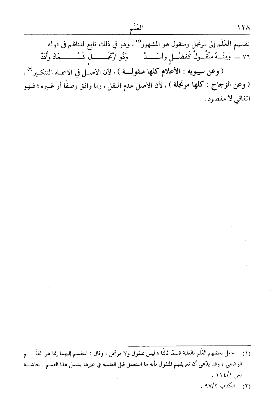 تقسيم العلم إلى مرتجل ومنقول هو المشهور1، وهو في ذلك تابع للناظم في قوله: