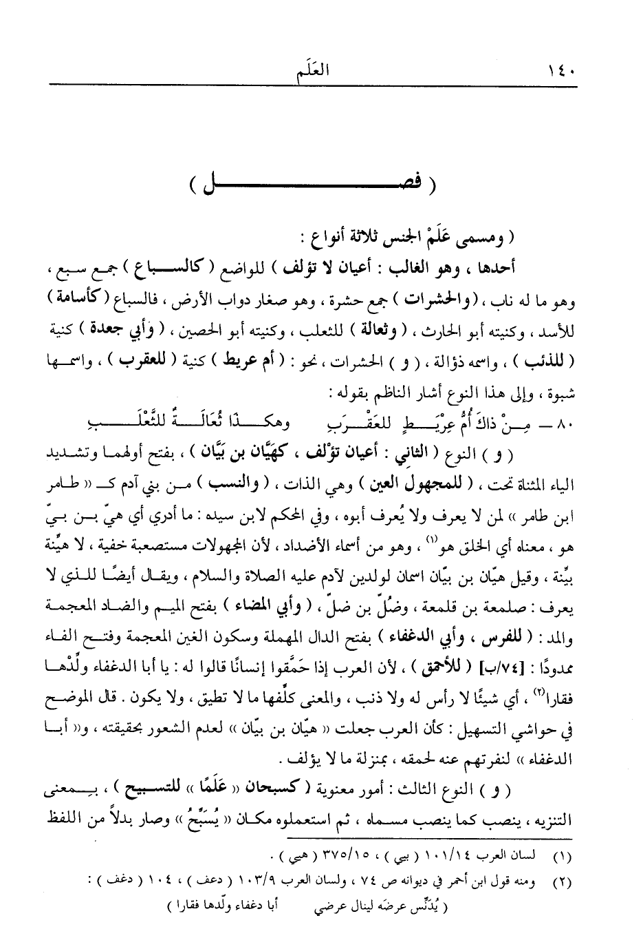 أحدها، وهو الغالب: أعيان لا تؤلف" للواضع "كالسباع" جمع سبع، وهو ما له ناب، "والحشرات" جمع حشرة، وهو صغار دواب الأرض، فالسباع "كأسامة" للأسد، وكنيته أبو الحارث، "وثعالة" للثعلب، وكنيته أبو الحصين، "وأبي جعدة" كنية "للذئب"، واسمه ذؤالة، "و" الحشرات، نحو: "أم عريط" كنية "للعقرب"، واسمها شبوة، وإلى هذا النوع أشار الناظم بقوله: