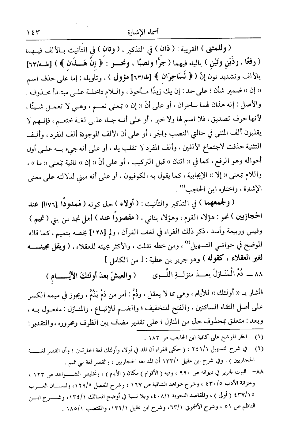 "وللمثنى" القريبة: "ذان" في التذكير، "وتان" في التأنيث بالألف فيهما "رفعا، وذَيْن وتَيْن" بالياء فيهما "جرا ونصبا، ونحو: {إِنْ هَذَانِ} " [طه: 63] بالألف وتشديد ونون إن {لَسَاحِرَانِ} [طه: 63] مؤول"، وتأويله: إما على حذف اسم "إن" ضمير شأن؛ على حد: إن يك زيدا مأخوذ، واللام داخلة على مبتدأ محذوف، والأصل: إنه هذان لهما ساحران، أو على أن "إن" بمعنى نعم، وهي لا تعمل شيئا؛ لأنها حرف تصديق، فلا اسم لها ولا خبر، أو على أنه جاء على لغة خثعم، فإنهم لا يقلبون ألف المثنى في حالتي النصب والجر، أو على أن الألف الموجودة ألف المفرد، وألف التثنية حذفت لاجتماع الألفين، وألف المفرد لا تقلب ياء، أو على أنه جيء به على أول أحواله وهو الرفع، كما في "اثنان" قبل التركيب، أو على أن "إن" نافية بمعنى "ما"، واللام بمعنى "إلا" الإيجابية، كما يقول به الكوفيون، أو على أنه مبني لدلالته على معنى الإشارة، واختاره ابن الحاجب1.