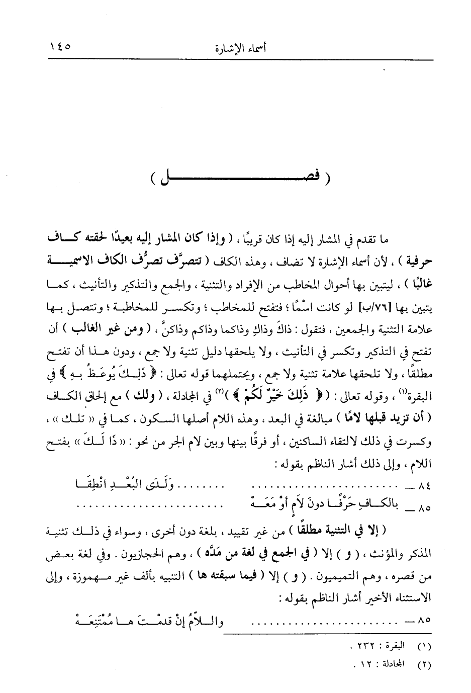 ما تقدم في المشار إليه إذا كان قريبا، " وإذا كان المشار إليه بعيدا لحقته كاف حرفية"؛ لأن أسماء الإشارة لا تضاف، وهذه الكاف "تنصرف تصرف الكاف الاسمية غالبا"، ليتبين بها أحوال المخاطب من الإفراد والتثنية، والجمع والتذكير والتأنيث، كما يتبين بها لو كانت اسما؛ فتفتح للمخاطب؛ وتكسر للمخاطبة؛ وتتصل بها علامة التثنية والجمعين، فتقول: ذاك وذاك وذاكما وذاكم وذاكن، "ومن غير الغالب" أن تفتح في التذكير وتكسر في التأنيث، ولا يلحقها دليل تثنية ولا جمع، ودون هذا أن تفتح مطلقا، ولا تلحقها علامة تثنية ولا جمع، ويحتملهما قوله تعالى: {ذَلِكَ يُوعَظُ بِهِ} في البقرة1، وقوله تعالى: " {ذَلِكَ خَيْرٌ لَكُمْ} "2 في المجادلة، "ولك" مع إلحاق الكاف "أن تزيد قبلها لاما" مبالغة في البعد، وهذه اللام أصلها السكون، كما في "تلك"، وكسرت في ذلك لالتقاء الساكنين، أو فرقا بينها وبين لام الجر من نحو: "ذا لك" بفتح اللام، وإلى ذلك أشار الناظم بقوله: