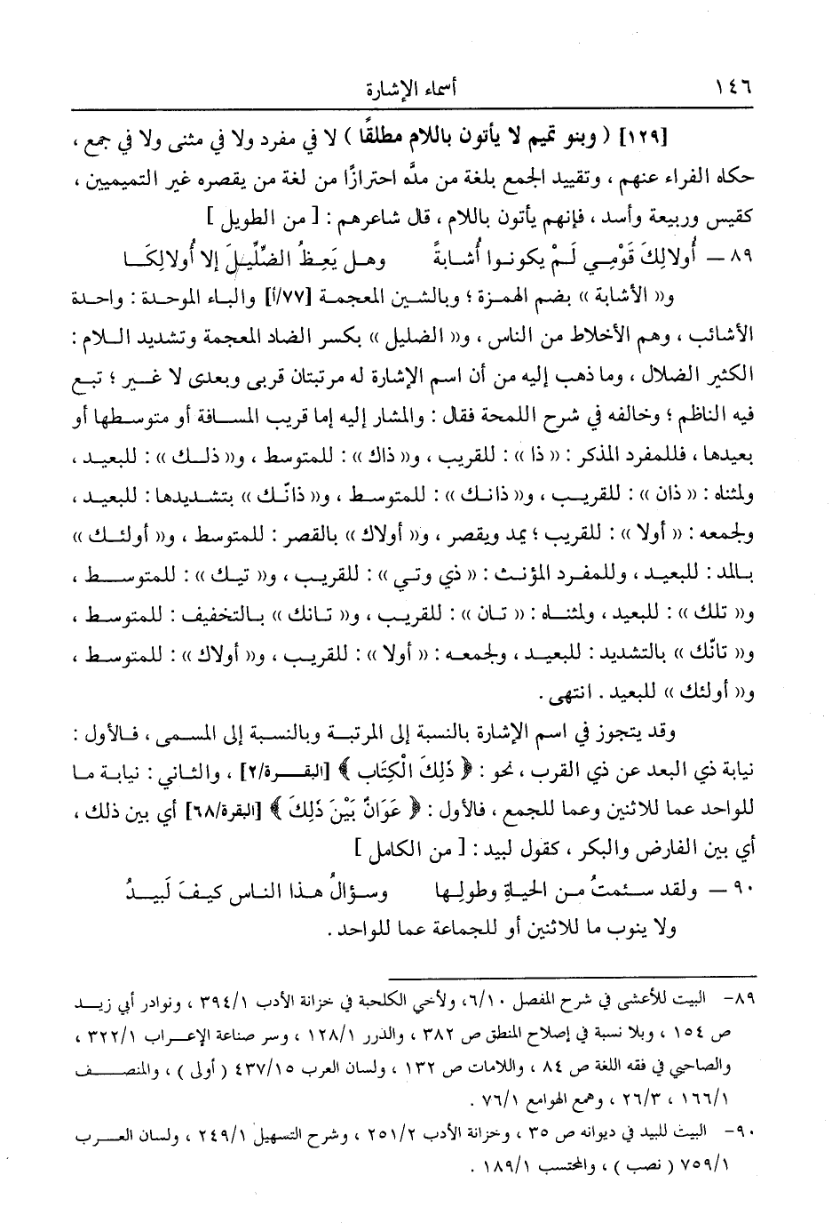 و"الأشابة" بضم الهمزة؛ وبالشين المعجمة والباء الموحدة: واحدة الأشائب، وهم الأخلاط من الناس، و"الضليل" بكسر الضاد المعجمة وتشديد اللام: الكثير الضلال، وما ذهب إليه من أن اسم الإشارة له مرتبتان قربى وبعدى لا غير؛ تبع فيه الناظم؛ وخالفه في شرح اللمحة فقال: والمشار إليه إما قريب المسافة أو متوسطها أو بعيدها، فللمفرد المذكر: "ذا": للقريب، و"ذاك": للمتوسط، و"ذلك": للبعيد، ولمثناه: "ذان": للقريب، و"ذانك": للمتوسط، و"ذانك" بتشديدها: للبعيد، ولجمعه: "أولا": لقريب؛ يمد ويقصر، و"أولاك" بالقصر: للمتوسط، و"أولئك" بالمد: للبعيد، وللمفرد المؤنث: "ذي وتي": للقريب، و"تيك": للمتوسط، و"تلك": للبعيد، ولمثناه: "تان": للقريب، و"تانك" بالتخفيف: للمتوسط، و"تانك" بالتشديد: للبعيد، ولجمعه: "أولا": للقريب، و"أولاك": للمتوسط، و"أولئك" للبعيد. ا. هـ.
