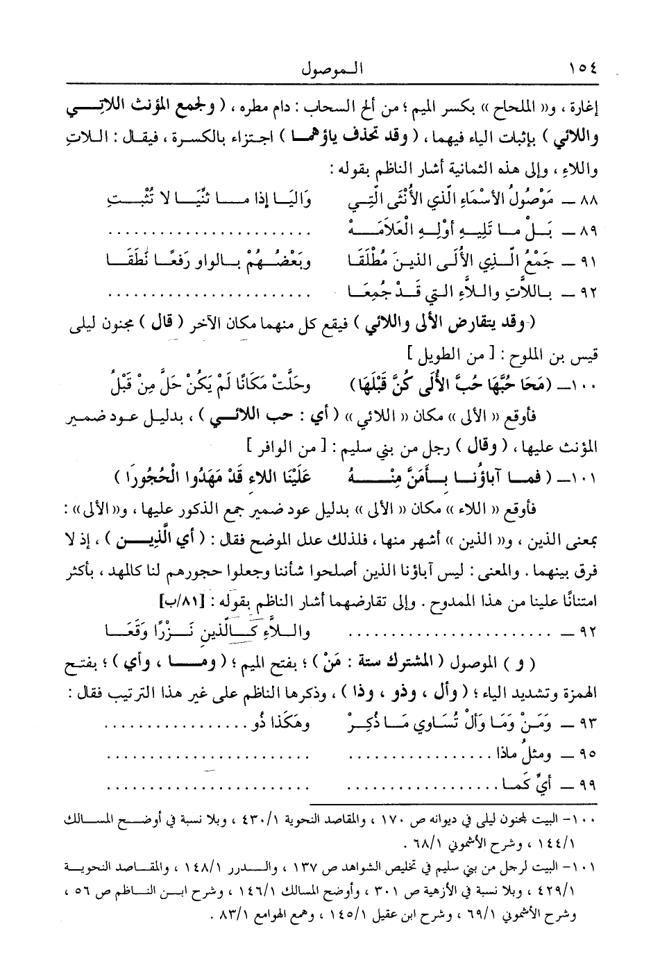 إغارة، و"الملحاح" بكسر الميم؛ من ألح السحاب: دام مطره، "ولجمع المؤنث اللاتي واللائي" بإثبات الياء فيهما، "قد تحذف ياؤهما" اجتزاء بالكسرة، فيقال: اللات واللاء، وإلى هذه الثمانية أشار الناظم بقوله: