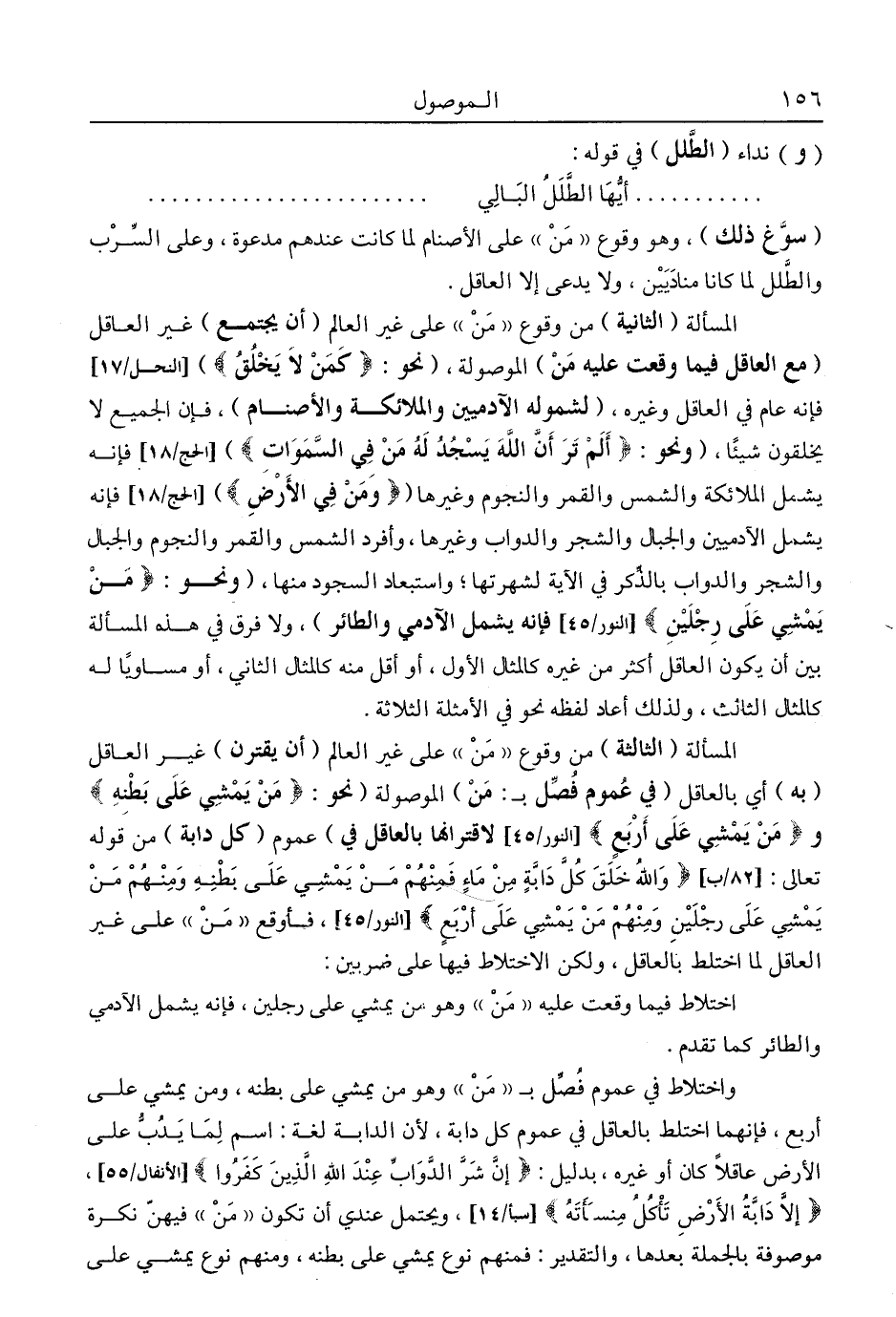 المسألة "الثانية" من وقوع "من" على غير العالم "أن يجتمع" غير العاقل "مع العاقل فيما وقعت عليه من" الموصولة، "نحو: {كَمَنْ لا يَخْلُقُ} [النحل: 17] فإنه عام في العاقل وغيره، "لشموله الآدميين والملائكة والأصنام"، فإن الجميع لا يخلقون شيئا، "ونحو: {أَلَمْ تَرَ أَنَّ اللَّهَ يَسْجُدُ لَهُ مَنْ فِي السَّمَاوَاتِ} [الحج: 18] فإنه يشمل الملائكة والشمس والقمر والنجوم وغيرها " {وَمَنْ فِي الْأَرْضِ} " [الحج: 18] فإنه الأدميين والجبال والشجر والدواب وغيرها، وأفرد الشمس والقمر والنجوم والجبال والشجر والدواب بالذكر في الآية لشهرتها؛ واستبعاد السجود منها، "ونحو: {مَنْ يَمْشِي عَلَى رِجْلَيْنِ} [النور: 45] فإنه يشمل الآدمي والطائر"، ولا فرق في هذه المسألة بين أن يكون العاقل أكثر من غيره كالمثال الأول، أو أقل منه كالمثال الثاني، أو مساويا له كالمثال الثالث، ولذلك أعاد لفظه نحو في الأمثلة الثلاثة.