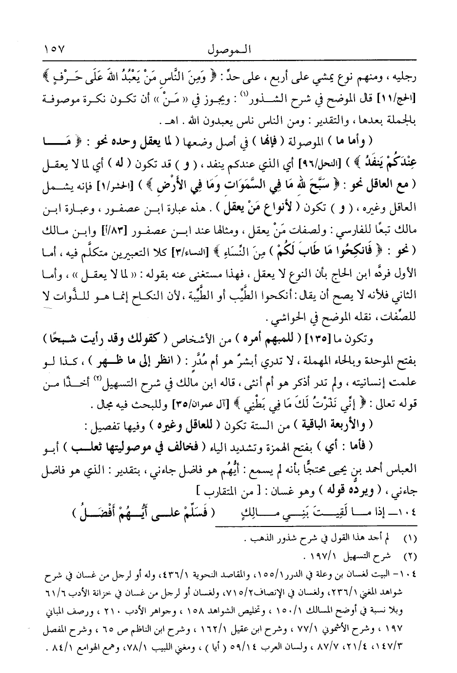 "وأما ما" الموصولة "فإنها" في أصل وضعها "لما يعقل وحده نحو: {مَا عِنْدَكُمْ يَنْفَدُ} [النحل: 96] أي: الذي عندكم ينفد، "و" قد تكون "له" أي: لما لا يعقل "مع العاقل نحو: {سَبَّحَ لِلَّهِ مَا فِي السَّمَاوَاتِ وَمَا فِي الْأَرْضِ} [الحشر: 1] فإنه يشمل العاقل وغيره، "و" تكون "لأنواع من يعقل". هذه عبارة ابن عصفور، وعبارة ابن مالك تبعا للفارسي: ولصفات من يعقل، ومثالها عند ابن عصفور وابن مالك "نحو: {فَانْكِحُوا مَا طَابَ لَكُمْ مِنَ النِّسَاءِ} [النساء: 3] كلا التعبيرين متكلم فيه، أما الأول فرده ابن الحاج بأن النوع لا يعقل، فهذا مستغنى عنه بقوله: "لما لا يعقل"، وأما الثاني فلأنه لا يصح أن يقال: أنكحوا الطيب أو الطيبة؛ لأن النكاح إنما هو للذوات لا للصفات، نقله الموضح في الحواشي.