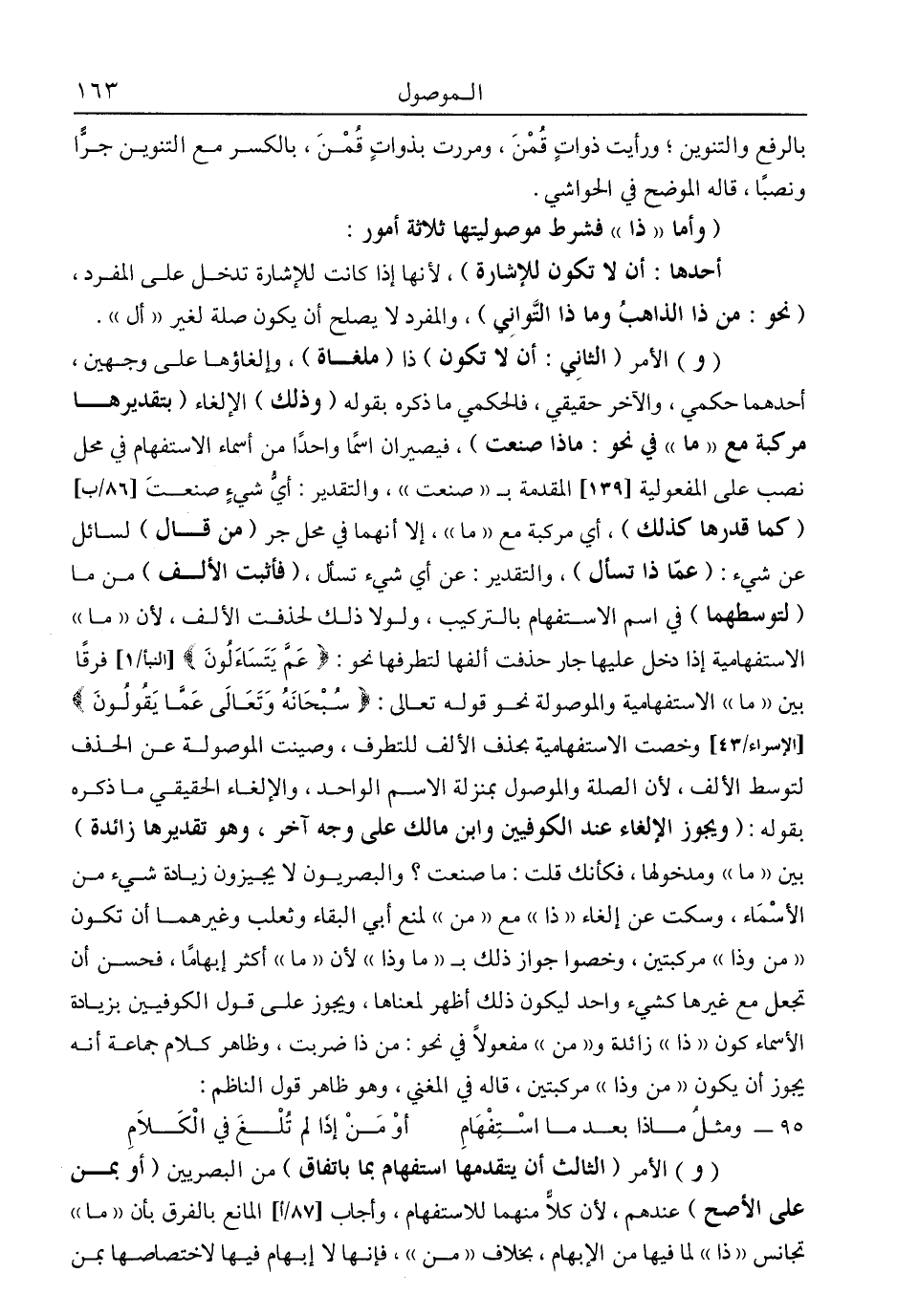 أحدها: أن لا تكون للإشارة"؛ لأنها إذا كانت للإشارة تدخل على المفرد، "نحو: من ذا الذاهب وماذا التواني"، والمفرد لا يصلح أن يكون صلة لغير "أل".
