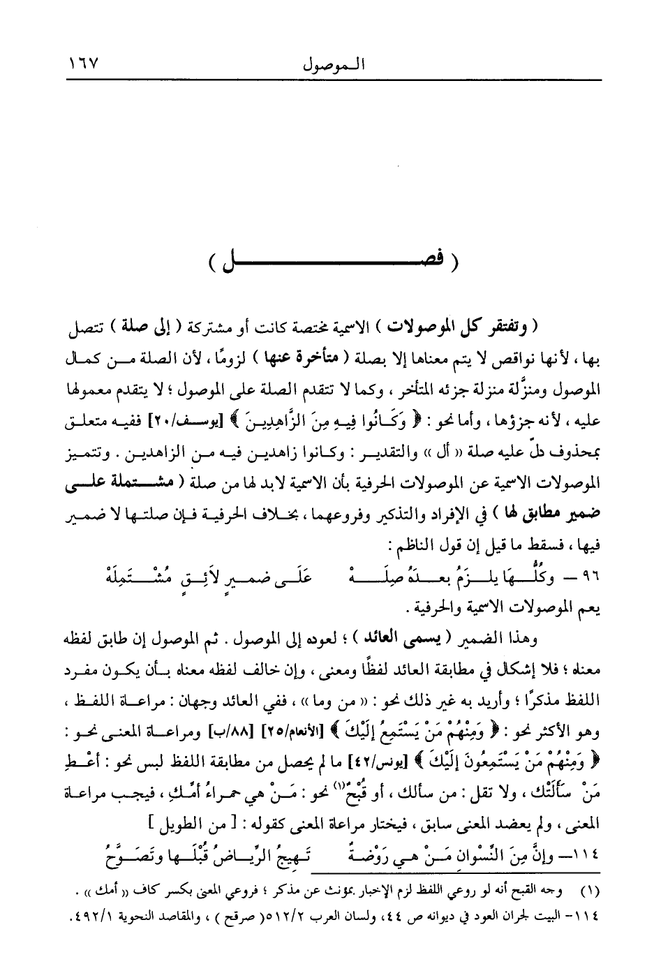 وهذا الضمير "يسمى العائد"؛ لعوده إلى الموصول، ثم الموصول إن طابق لفظه معناه؛ فلا إشكال في مطابقة العائد لفظا ومعنى، وإن خالف لفظه معناه بأن يكون مفرد اللفظ مذكرا؛ وأريد به غير ذلك نحو: "من وما"، ففي العائد وجهان: مراعاة اللفظ، وهو الأكثر نحو: {وَمِنْهُمْ مَنْ يَسْتَمِعُ إِلَيْكَ} [الأنعام: 25] ومراعاة المعنى نحو: {وَمِنْهُمْ مَنْ يَسْتَمِعُونَ إِلَيْكَ} [يونس: 42] ما لم يحصل من مطابقة اللفظ لبس نحو: أعط من سألتك، ولا تقل: من سألك، أو قبح1 نحو: من هي حمراء أمك، فيجب مراعاة المعنى، ولم يعضد المعنى سابق، فيختار مراعاة المعنى كقوله: [من الطويل]