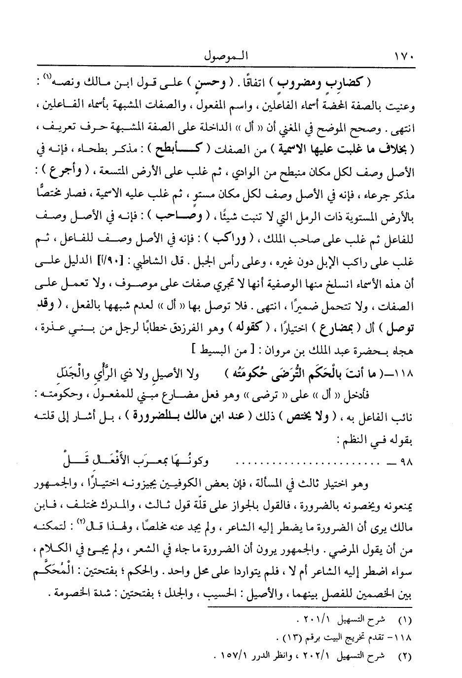 وهو اختيار ثالث في المسألة، فإن بعض الكوفيين يجيزونه اختيارا، والجمهور يمنعونه ويخصونه بالضرورة، فالقول بالجواز على قلة قول ثالث، والمدرك مختلف، فابن مالك يرى أن الضرورة ما يضطر إليه الشاعر، ولم يجد عنه مخلصا، ولهذا قال2: لتمكنه من أن يقول المرضي. والجمهور يرون أن الضرورة ما جاء في الشعر، ولم يجئ في الكلام، سواء اضطر إليه الشاعر أم لا، فلم يتواردا على محل واحد. والحكم؛ بفتحتين: المحكم بين الخصمين للفصل بينهما، والأصيل: الحسيب، والجدل؛ بفتحتين: شدة الخصومة.