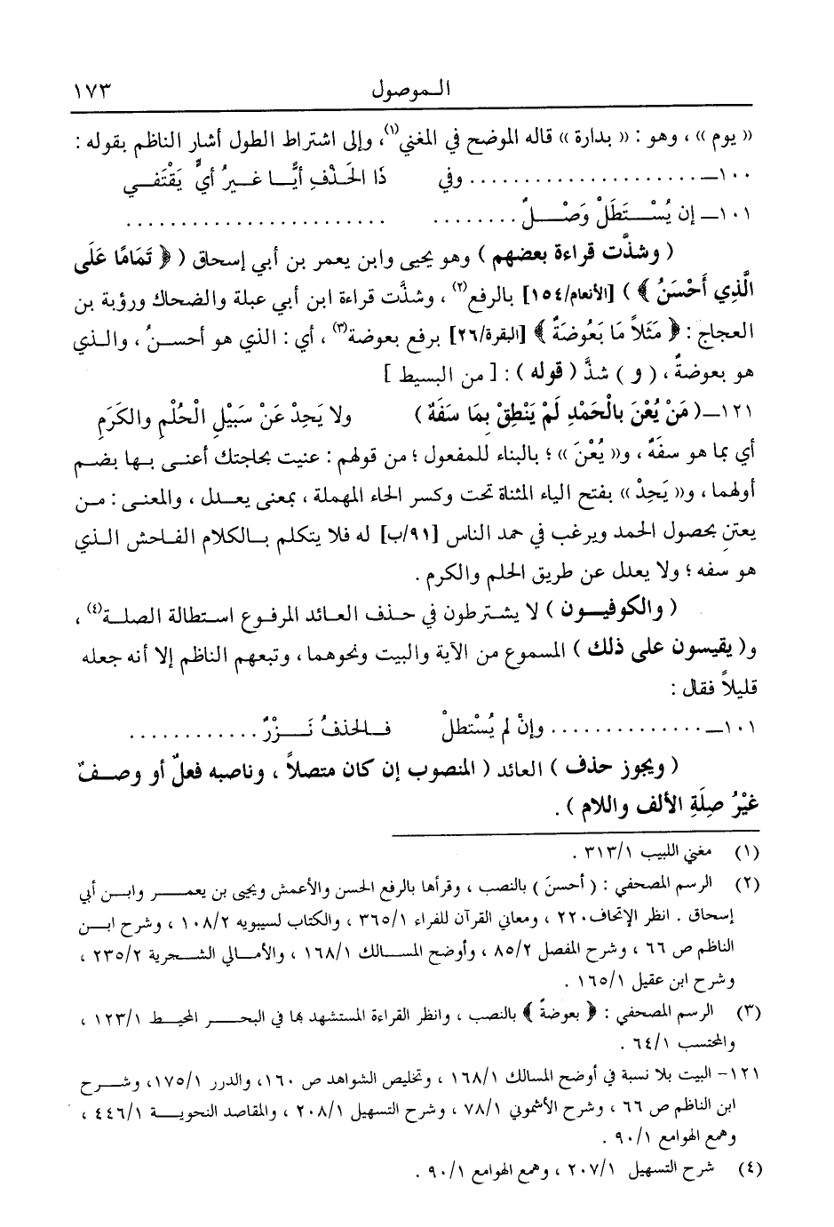 "وشذت قراءة بعضهم" وهو يحيى وابن يعمر بن أبي إسحاق "تَمَامًا عَلَى الَّذِي أَحْسَنُ" [الأنعام: 154] بالرفع2، وشذت قراءة ابن أبي عبلة والضحاك ورؤبة بن العجاج: "مَثَلًا مَا بَعُوضَةٌ" [البقرة: 26] برفع بعوضة3، أي: الذي هو أحسن، والذي هو بعوضة، "و" شذ "قوله": [من البسيط]