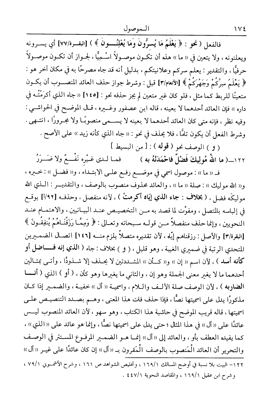 فالفعل "نحو: {يَعْلَمُ مَا يُسِرُّونَ وَمَا يُعْلِنُونَ} [البقرة: 77] أي: يسرونه ويعلنونه، ولا يتعين في "ما" هذه أن تكون موصولا اسميا، لجواز أن تكون موصولا حرفيا، والتقدير: يعلم سركم وعلانيتكم، بدليل أنه قد جاء مصرحا به في مكان آخر هو: {يَعْلَمُ سِرَّكُمْ وَجَهْرَكُمْ} [الأنعام: 3] قيل: وشرط جواز حذف العائد المنصوب أن يكون متعينا للربط كما مثل، فلو كان غير متعين لم يجز حذفه نحو: "جاء الذي أكرمته في داره" فإن العائد أحدهما لا بعينه، قاله ابن عصفور وغيره، قال الموضح في الحواشي: وفيه نظر، فإنه متى كان العائد أحدهما لا بعينه لا يسمى منصوبا ولا مجرورا، ا. هـ. وشرط الفعل أن يكون تاما، فلا يحذف في نحو: "جاء الذي كأنه زيد" على الأصح.
