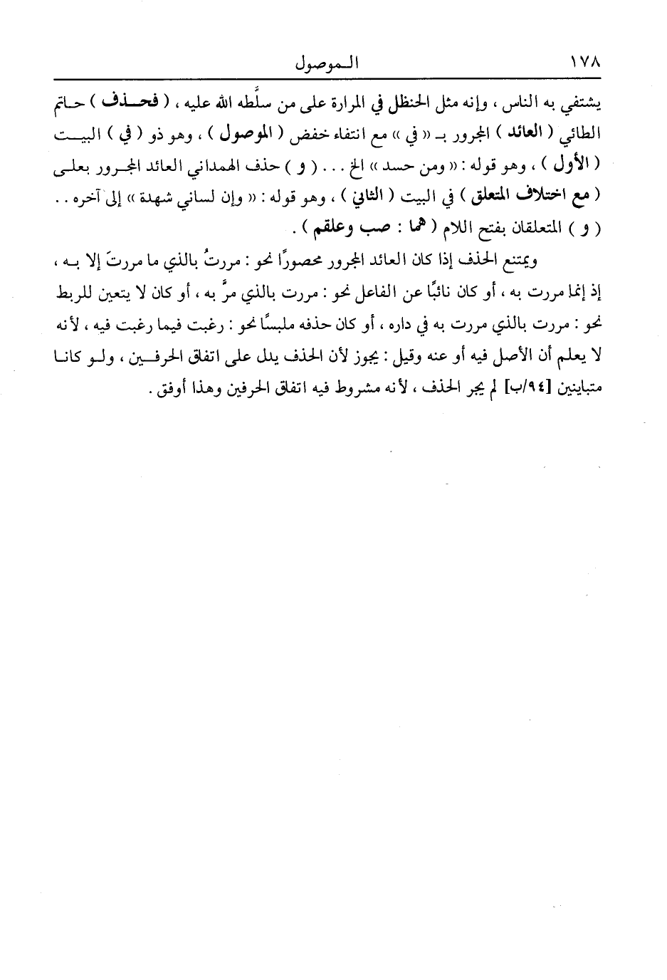 ويمتنع الحذف إذا كان العائد المجرور محصورا نحو: مررت بالذي ما مررت إلا به، إذ إنما مررت به، أو كان نائبا عن الفاعل نحو: مررت بالذي مر به، أو كان لا يتعين للربط نحو: مررت بالذي مررت به في داره، أو كان حذفه ملبسا نحو: رغبت فيما رغبت فيه؛ لأنه لا يعلم أن الأصل فيه أو عنه وقيل: يجوز لأن الحذف يدل على اتفاق الحرفين، ولو كانا متباينين لم يجر الحذف؛ لأنه مشروط فيه اتفاق الحرفين وهذا أوفق.