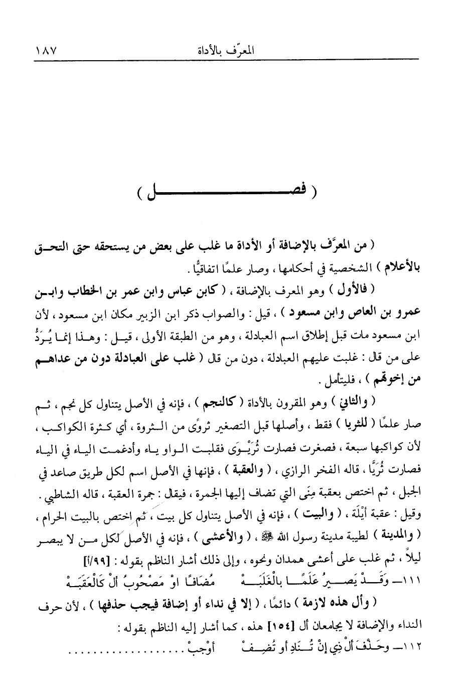 "والثاني" وهو المقرون بالأداة "كالنجم"، فإنه في الأصل يتناول كل نجم، ثم صار علما "للثريا" فقط، وأصلها قبل التصغير ثروى من الثروة، أي: كثرة الكواكب؛ لأن كواكبها سبعة، فصغرت فصارت ثُرَيْوَى فقلبت الواو ياء وأدغمت الياء في الياء فصارت ثريا، قاله الفخر الرازي، "والعقبة"، فإنها في الأصل اسم لكل طريق صاعد في الجبل، ثم اختص بعقبة منى التي تضاف إليها الجمرة، فيقال: جمرة العقبة، قاله الشاطبي. وقيل: عقبة أيلة، "والبيت"، فإنه في الأصل يتناول كل بيت، ثم اختص بالبيت الحرام، "والمدينة" لطيبة مدينة رسول الله صلى الله عليه وسلم، "والأعشى"، فإنه في الأصل لكل من لا يبصر ليلا، ثم غلب على أعشى همدان ونحوه، وإلى ذلك أشار الناظم بقوله: