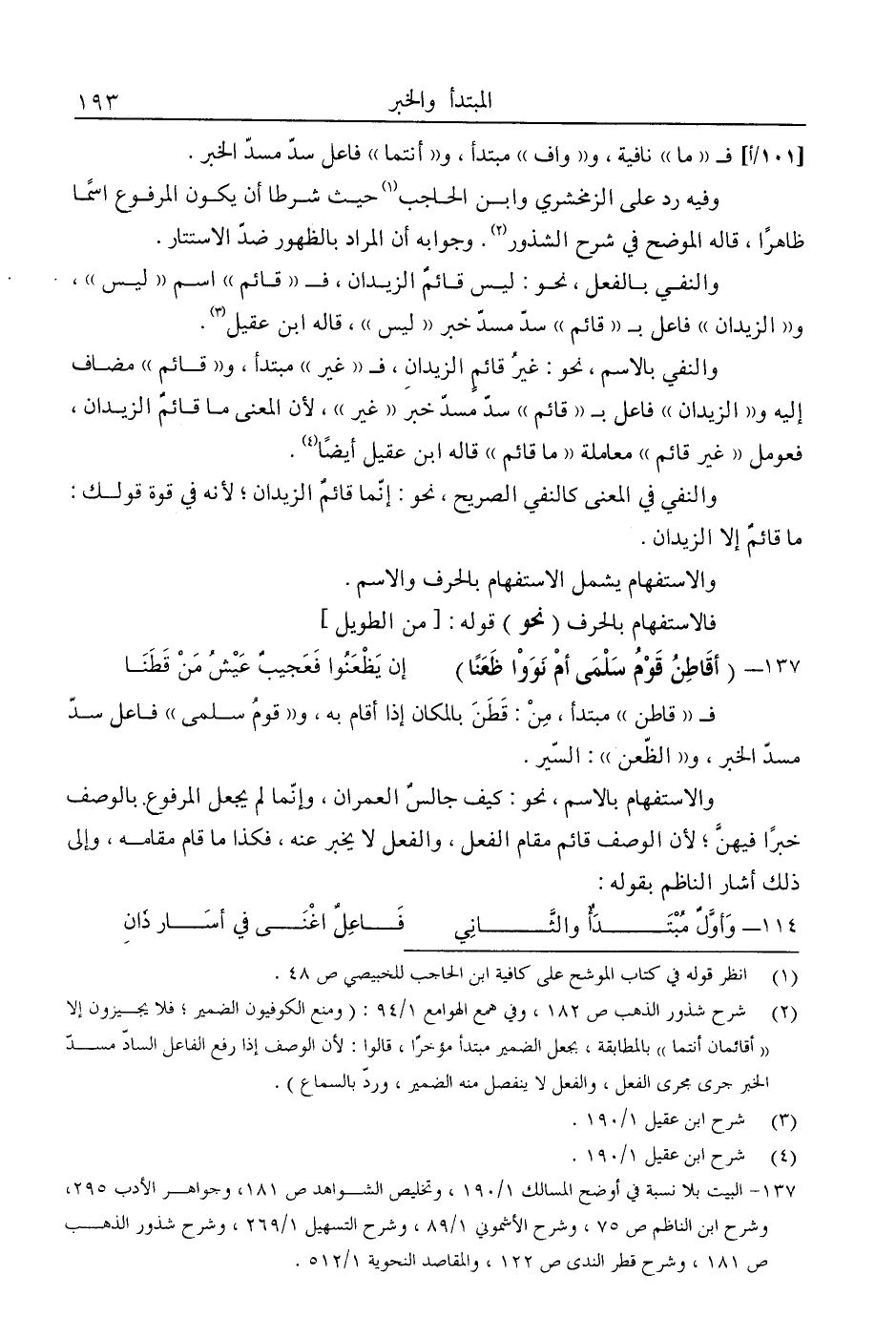 2 شرح شذور الذهب ص182، وفي همع الهوامع 1/ 94: "ومنع الكوفيون الضمير؛ فلا يجيزون إلا "أقائمان أنتما" بالمطابقة، بجعل الضمير مبتدأ مؤخرا، قالوا: لأن الوصف إذا رفع الفاعل الساد مسد الخبر جرى مجرى الفعل، والفعل لا ينفصل منه الضمير، ورد بالسماع".