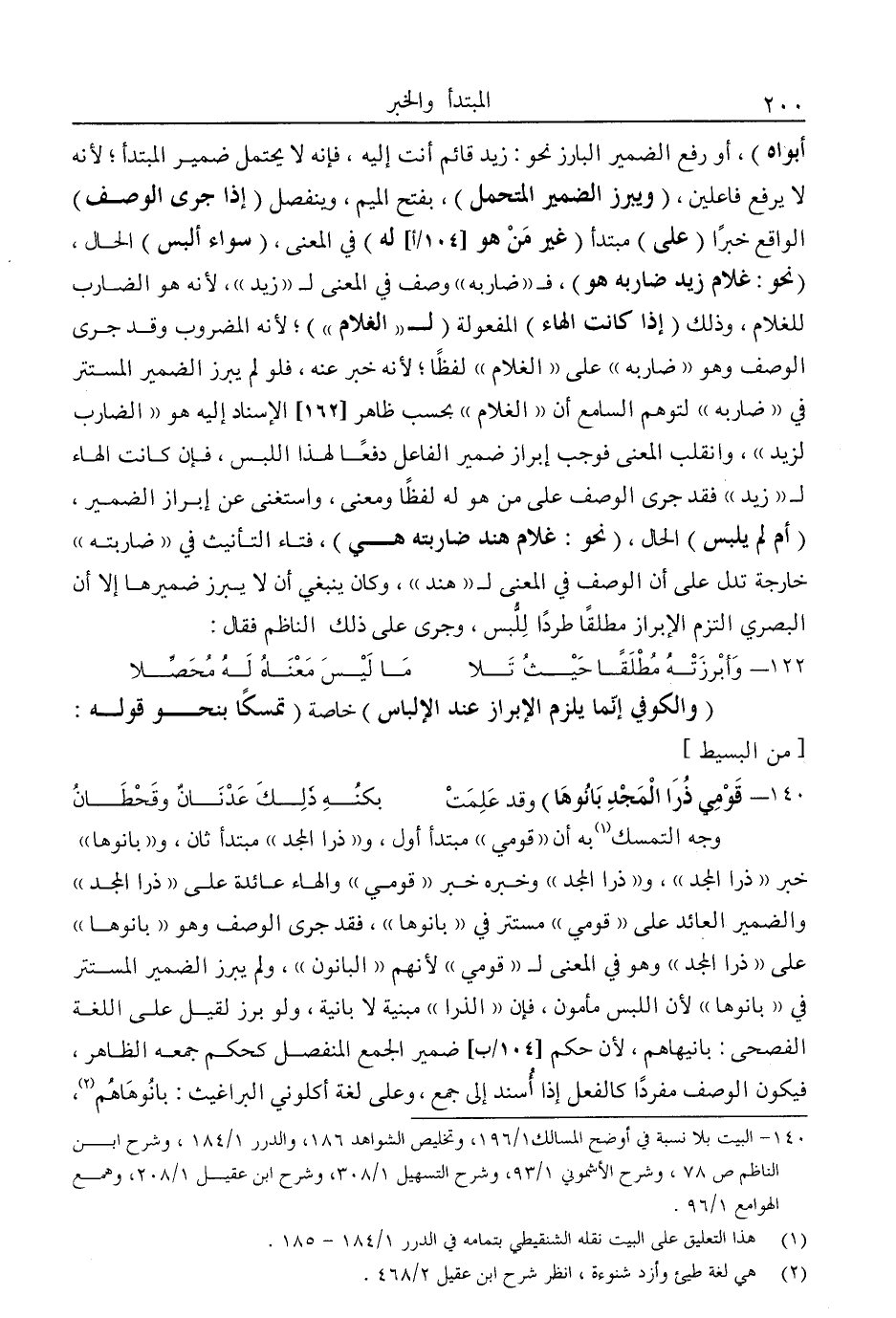 وجه التمسك1 به أن "قومي" مبتدأ أول، و"ذرا المجد" مبتدأ ثان، و"بانوها" خبر "ذرا المجد"، و"ذرا المجد" وخبره خبر "قومي" والهاء عائدة على "ذرا المجد" والضمير العائد على "قومي" مستتر في "بانوها"، فقد جرى الوصف وهو "بانوها" على "ذرا المجد" وهو في المعنى لـ"قومي" لأنهم "البانون"، ولم يبرز الضمير المستتر في "بانوها" لأن اللبس مأمون، فإن "الذرا" مبنية لا بانية، ولو برز لقيل على اللغة الفصحى: بانيهاهم؛ لأن حكم ضمير الجمع المنفصل كحكم جمعه الظاهر، فيكون الوصف مفردا كالفعل إذا أسند إلى جمع، وعلى لغة أكلوني البراغيث: بانوهاهم2،