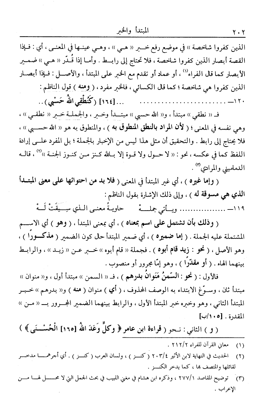 فالأول: "نحو: السمن منوان بدرهم"، فـ"السمن" مبتدأ أول، و"منوان" مبتدأ ثان، وسوغ الابتداء به الوصف المحذوف، "أي" منوان "منه" و"بدرهم" خبر المبتدأ الثاني، وهو وخبره خبر المبتدأ الأول، والرابط بينهما الضمير المجرور بـ"من" المقدرة.