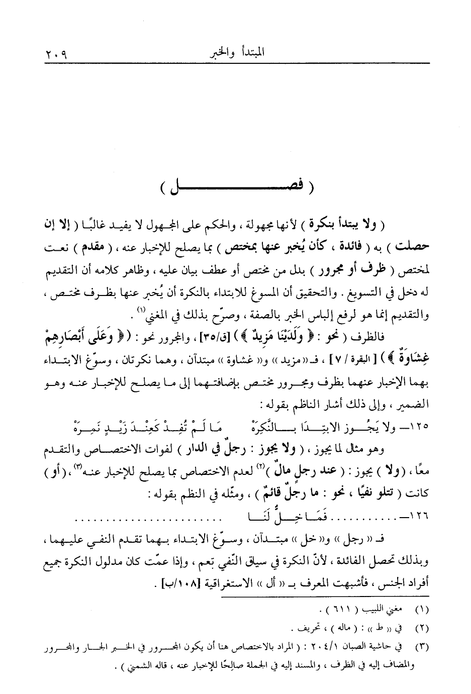 3 في حاشية الصبان 1/ 204: "المراد بالاختصاص هنا أن يكون المجرور في الخبر الجار والمجرور والمضاف إليه في الظرف، والمسند إليه في الجملة صالحا للإخبار عنه، قاله الشمني".