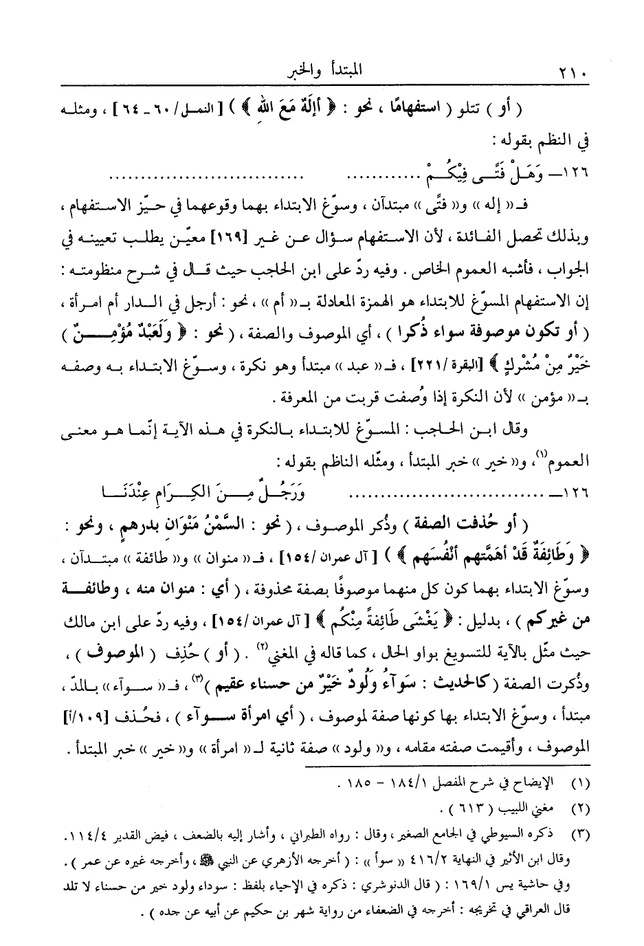 فـ"إله" و"فتى" مبتدآن، وسوغ الابتداء بهما وقوعهما في حيز الاستفهام, وبذلك تحصل الفائدة؛ لأن الاستفهام سؤال عن غير معين يطلب تعيينه في الجواب، فأشبه العموم الخاص. وفيه رد على ابن الحاجب حيث قال في شرح منظومته: إن الاستفهام المسوغ للابتداء هو الهمزة المعادلة بـ"أم"، نحو: أرجل في الدار أم امرأة، "أو تكون موصوفة سواء ذكرا"، أي: الموصوف والصفة، "نحو: {وَلَعَبْدٌ مُؤْمِنٌ" خَيْرٌ مِنْ مُشْرِكٍ} [البقرة: 221] ، فـ"عبد" مبتدأ وهو نكرة، وسوغ الابتداء به وصفه بـ"مؤمن" لأن النكرة إذا وصفت قربت من المعرفة.