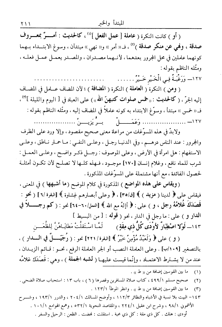 "ومن" النكرة "العاملة" النكرة "المضافة"؛ لأن المضاف عامل في المضاف إليه الجر، "كالحديث: "خمس صلوات كتبهن الله" " على العباد في [اليوم والليلة] 3، فـ"خمس" مبتدأ، وسوغ الابتداء به كونه عاملا في المضاف إليه، ومثله الناظم بقوله: