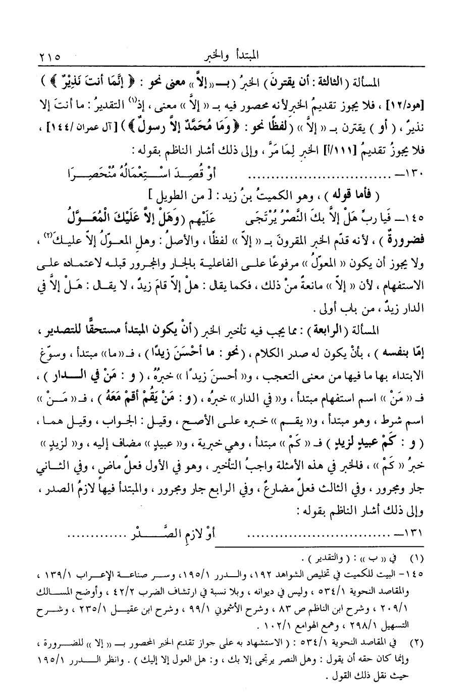 2 في المقاصد النحوية 1/ 534: "الاستشهاد به على جواز تقديم الخبر المحصور بـ"إلا" للضرورة، وإنما كان حقه أن يقول: وهل النصر يرتجى إلا بك، و: هل العول إلا إليك". وانظر الدرر 1/ 195 حيث نقل ذلك القول.