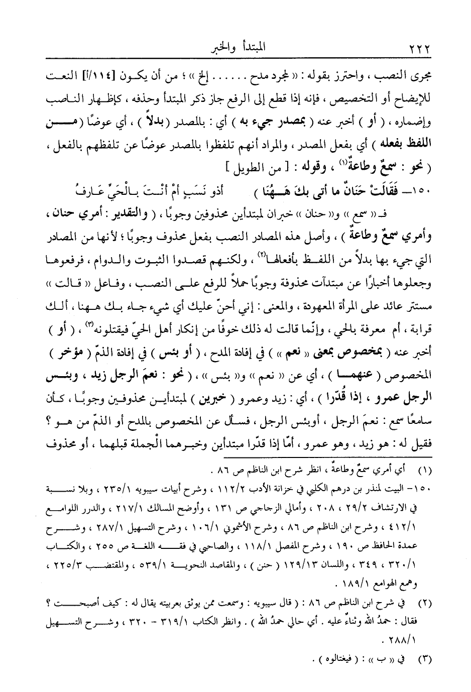 فـ"سمع" و"حنان" خبران لمبتدأين محذوفين وجوبا، "والتقدير: أمري حنان، وأمري سمع وطاعة"، وأصل هذه المصادر النصب بفعل محذوف وجوبا؛ لأنها من المصادر التي جيء بها بدلا من اللفظ بأفعالها2، ولكنهم قصدوا الثبوت والدوام، فرفعوها وجعلوها أخبارا عن مبتدآت محذوفة وجوبا حملا للرفع على النصب، وفاعل "قالت" مستتر عائد على المرأة المعهودة، والمعنى: إني أحن عليك أي شيء جاء بك ههنا، ألك قرابة، أم معرفة بالحي، وإنما قالت له ذلك خوفا من إنكار أهل الحي فيقتلونه3، "أو" أخبر عنه "بمخصوص بمعنى "نعم"" في إفادة المدح، "أو بئس" في إفادة الذم "مؤخر" المخصوص "عنهما"، أي: عن "نعم" و"بئس"، "نحو: نعم الرجل زيد، وبئس الرجل عمرو، إذا قدرا"، أي: زيد وعمرو "خبرين" لمبتدأين محذوفين وجوبا، كأن سامعا سمع: نعم الرجل، أو بئس الرجل، فسأل عن المخصوص بالمدح أو الذم من هو؟ فقيل له: هو زيد، وهو عمرو، أما إذا قدرا مبتدأين وخبرهما الجملة قبلهما، أو محذوف