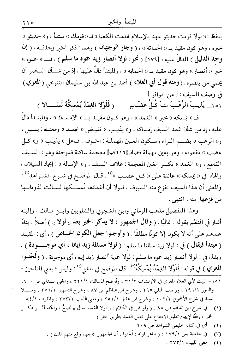 بلفظ: "لولا قومك حديثو عهد بالإسلام لهدمت الكعبة" فـ"قومك" مبتدأ، و"حديثو" خبره، وهو كون مقيد بـ"الحداثة"، "وجاز الوجهان" وهما: ذكر الخبر وحذفه، "إن وجد الدليل" الدال عليه، "نحو: لولا أنصار زيد حموه ما سلم"، فـ"حموه" خبر "أنصار" وهو كون مقيد بـ"الحماية"، والمبتدأ دال عليها، إذ من شأن الناصر أن يحمي من ينصره، "ومنه قول أبي العلاء" أحمد بن عبد الله بن سليمان التنوخي "المعري" في وصف السيف: [من الوافر]