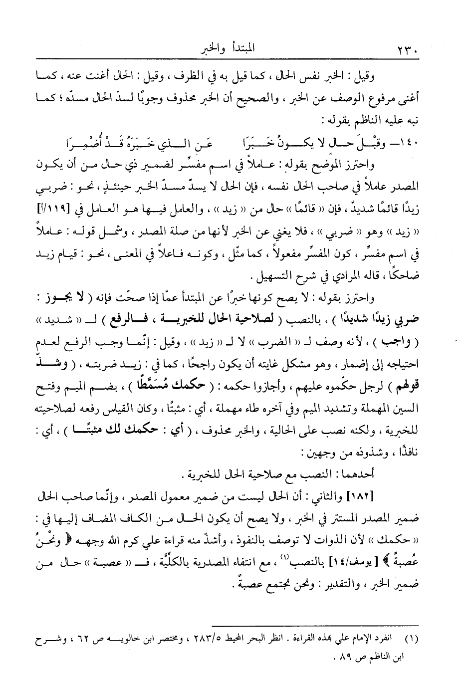 وقيل: الخبر نفس الحال، كما قيل به في الظرف، وقيل: الحال أغنت عنه، كما أغنى مرفوع الوصف عن الخبر، والصحيح أن الخبر محذوف وجوبا لسد الحال مسده؛ كما نبه عليه الناظم بقوله: