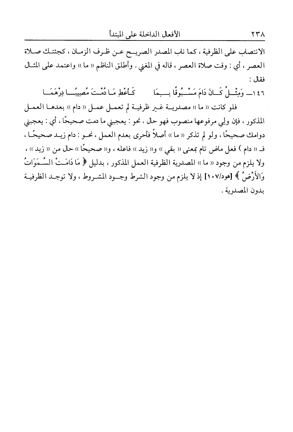 فلو كانت "ما" مصدرية غير ظرفية لم تعمل عمل "دام" بعدها العمل المذكور، فإن ولي مرفوعها منصوب فهو حال، نحو: يعجبني ما دمت صحيحًا، أي: يعجبني دوامك صحيحًا، ولو لم تذكر "ما" أصلًا فأحرى بعدم العمل، نحو: دام زيد صحيحًا، فـ "دام" فعل ماض تام بمعنى "بقي" و"زيد" فاعله، و"صحيحًا" حال من "زيد"، ولا يلزم من وجود "ما" المصدرية الظرفية العمل المذكور، بدليل {مَا دَامَتِ السَّمَوَاتُ وَالْأَرْضُ} [هود: 107] إذ لا يلزم من وجود الشرط وجود المشروط، ولا توجد الظرفية بدون المصدرية.