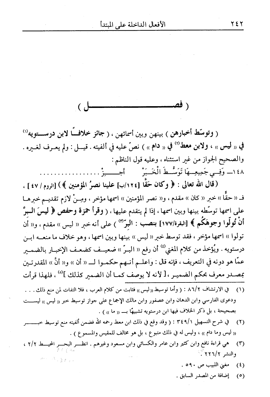 "قال الله تعالى: {وَكَانَ حَقًّا عَلَيْنَا نَصْرُ الْمُؤْمِنِينَ} [الروم: 47] ، فـ"حقا" خبر "كان" مقدم، و"نصر المؤمنين" اسمها مؤخر، ومن لازم تقديم خبرها على اسمها توسطه بينها وبين اسمها، إذا لم يتقدم عليها، "وقرأ حمزة وحفص {لَيْسَ الْبِرَّ أَنْ تُوَلُّوا وُجُوهَكُمْ} [البقرة: 177] بنصب: البر3" على أنه خبر "ليس" مقدم، و"أن تولوا" اسمها مؤخر، فقد توسط خبر "ليس" بينها وبين اسمها، وهو خلاف ما منعه ابن درستويه. ويؤخذ من كلام المغني4 أن رفع "البر" ضعيف كضعف الإخبار بالضمير عما هو دونه في التعريف، فإنه قال: واعلم أنهم حكموا لـ"أن" و"أنّ" المقدرتين بمصدر معرف بحكم الضمير؛ [لأنه لا يوصف كما أن الضمير كذلك] 5، فلهذا قرأت