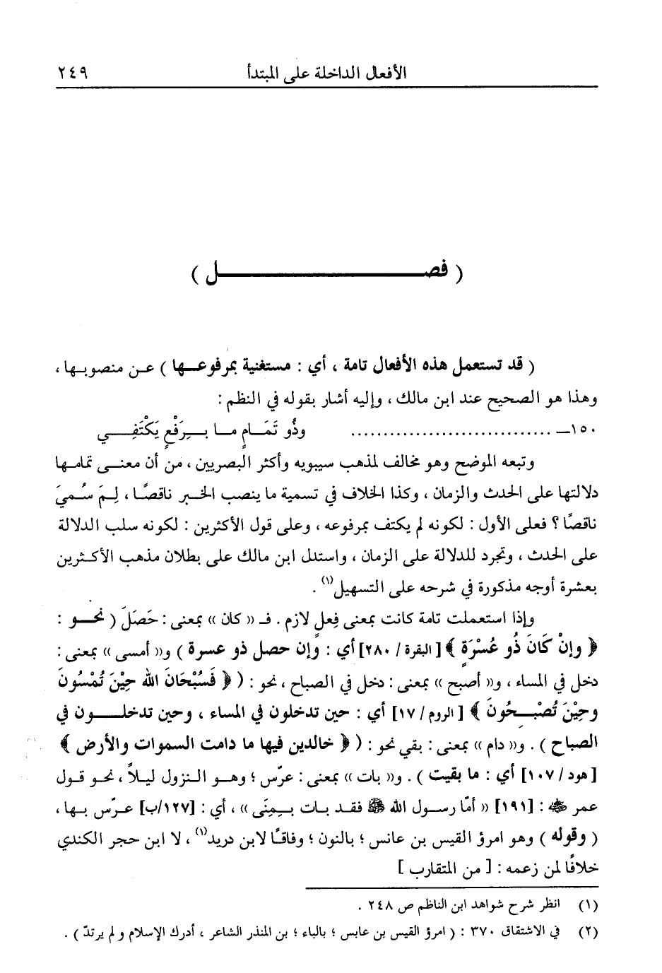 وإذا استعملت تامة كانت بمعنى فعل لازم. فـ"كان" بمعنى: حصل "نحو: {وَإِنْ كَانَ ذُو عُسْرَةٍ} [البقرة: 280] أي: وإن حصل ذو عسرة" و"أمسى" بمعنى: دخل في المساء، و"أصبح" بمعنى: دخل في الصباح، نحو: {فَسُبْحَانَ اللَّهِ حِينَ تُمْسُونَ وَحِينَ تُصْبِحُونَ} [الروم: 17] أي: حين تدخلون في المساء، وحين تدخلون في الصباح". و"دام" بمعنى: بقي نحو: " {خَالِدِينَ فِيهَا مَا دَامَتِ السَّمَوَاتُ وَالْأَرْضُ} [هود: 107] أي: ما بقيت". و"بات" بمعنى: عرس؛ وهو النزول ليلًا، نحو قول عمر رضي الله عنه: "أما رسول الله صلى الله عليه وسلم فقد بات بمنى" أي: عرس بها، "وقوله" وهو امرؤ القيس بن عانس؛ بالنون؛ وفاقًا لابن دريد2، لا ابن حجر الكندي خلافًا لمن زعمه: [من المتقارب]
