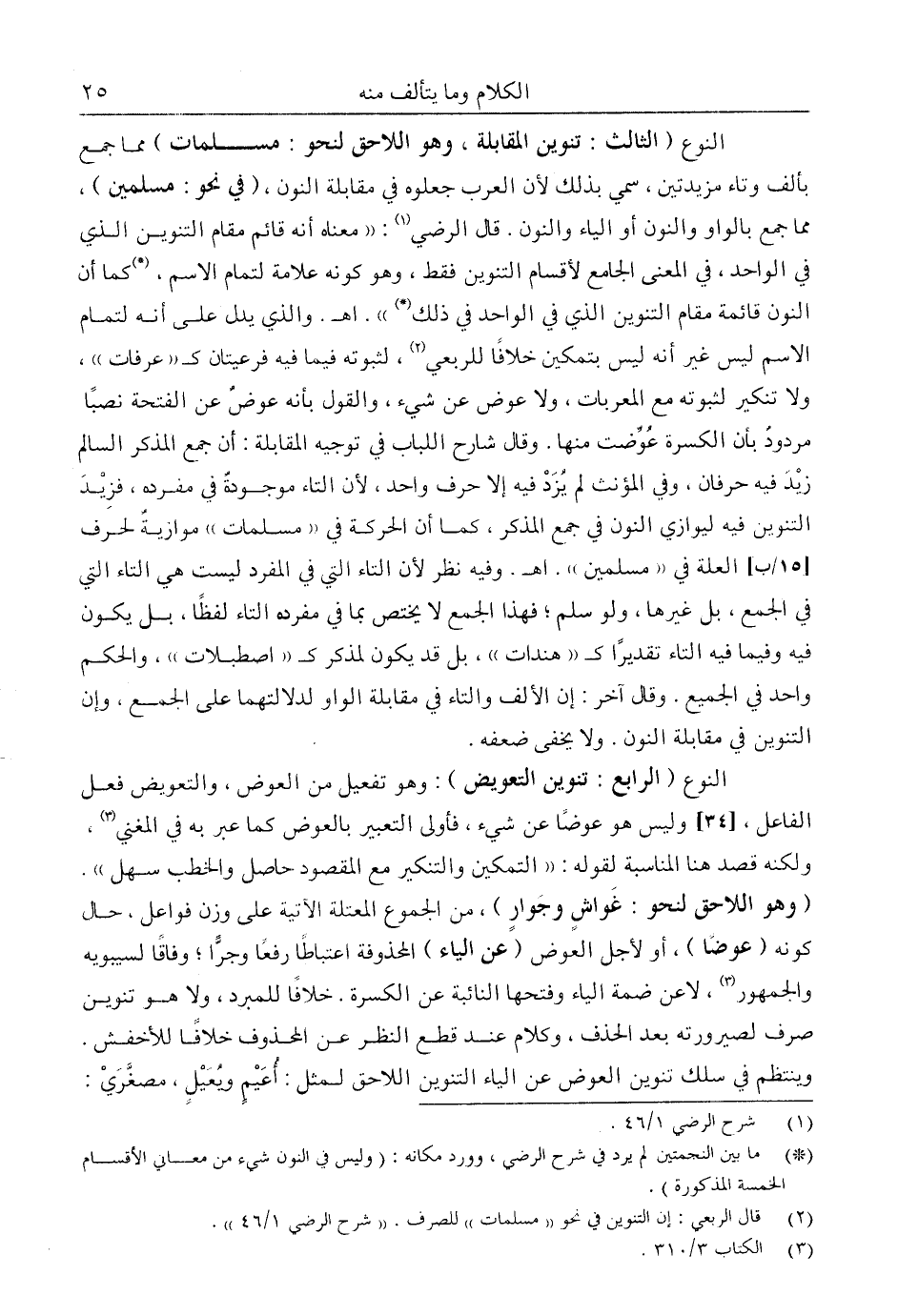 3 قال الربعي: إن التنوين في نحو "مسلمات" للصرف. "شرح الرضي 1/ 46".