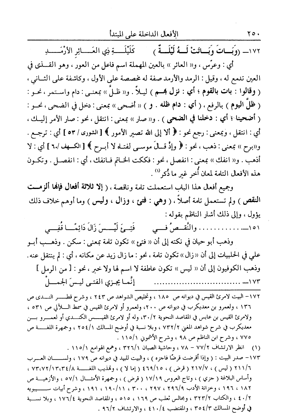 أي: وعرس، و"العائر" بالعين المهملة اسم فاعل من العور، وهو القذى في العين تدمع له، وقيل: الرمد والأرمد صفة له مخصصة على الأول، وكاشفة على الثاني، "وقالوا: بات بالقوم؛ أي: نزل بهم" ليلًا. و"ظل" بمعنى: دام واستمر، نحو: "ظل اليوم" بالرفع، "أي: دام ظله. و" "أضحى" بمعنى: دخل في الضحى، نحم: "أضحينا؛ أي: دخلنا في الضحى". و"صار" بمعنى: انتقل، نحو: صار الأمر إليك، أي: انتقل، وبمعنى: رجع نحو: {أَلَا إِلَى اللَّهِ تَصِيرُ الْأُمُورُ} [الشورى: 53] أي: ترجع.