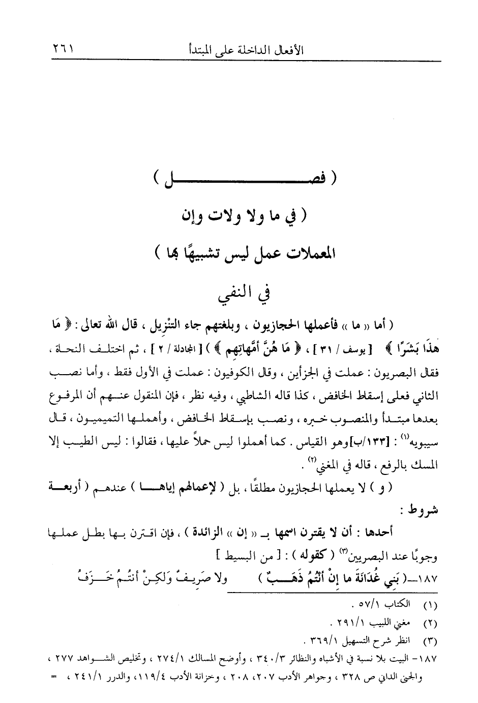 "فصل": "في ما ولا ولات وإن المعملات عمل ليس تشبيهًا بها" في النفي