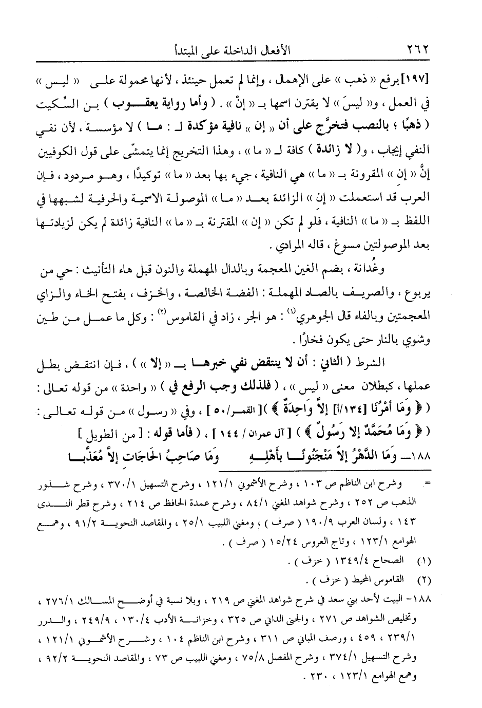 الشرط "الثاني: أن لا ينتقض نفي خبرها بـ"إلا"، فإن انتقض بطل عملها، كبطلان معنى "ليس" "فلذلك وجب الرفع في" "واحدة" من قوله تعالى: {وَمَا أَمْرُنَا إِلَّا وَاحِدَةٌ} [القمر: 50] وفي "رسول" من قوله تعالى: {وَمَا مُحَمَّدٌ إِلَّا رَسُولٌ} [آل عمران: 144] ، "فأما قوله: [من الطويل]