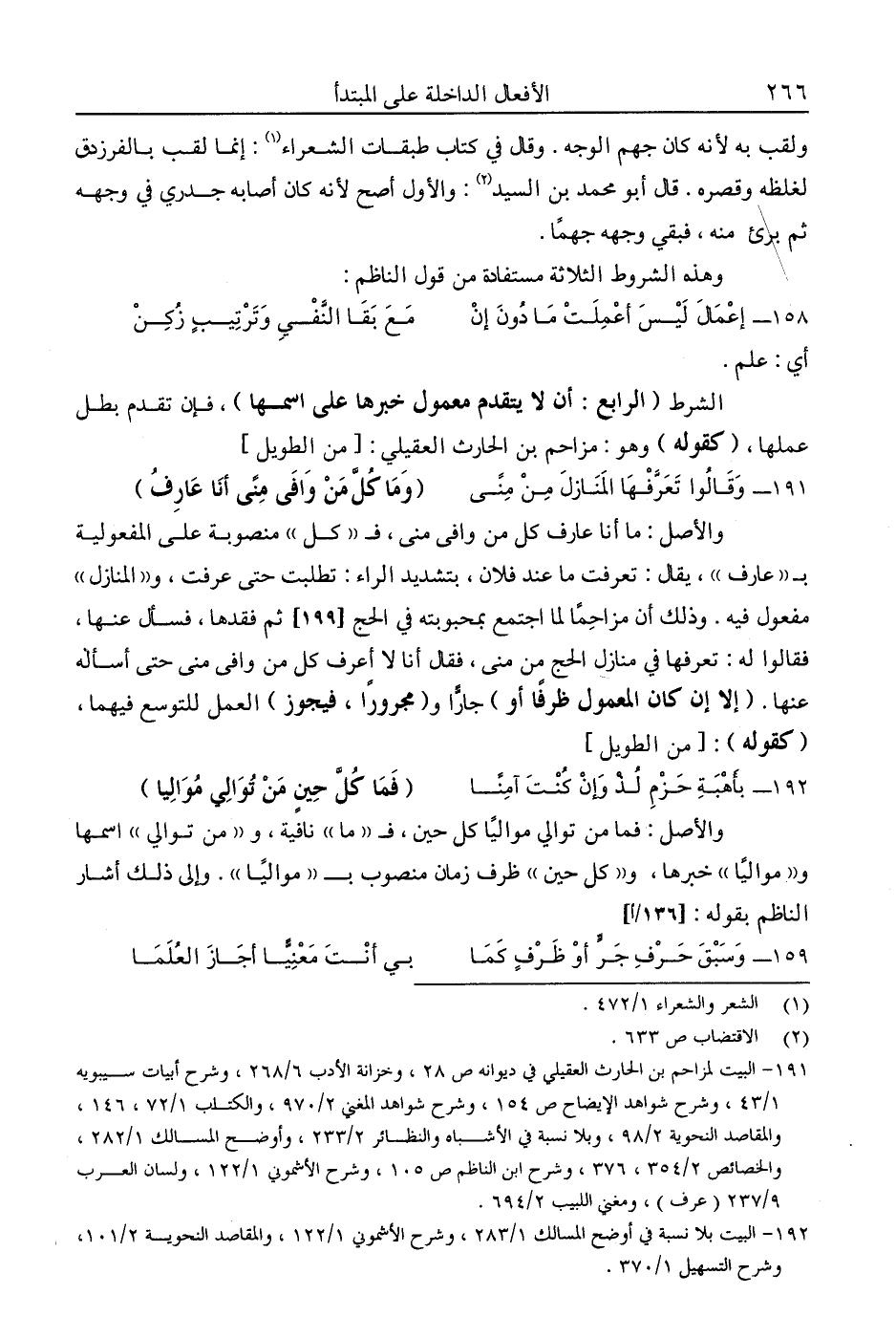 191- البيت لمزاحم بن الحارث العقيلي في ديوانه ص28، وخزانة الأدب 6/ 268، وشرح أبيات سيبويه 1/ 43، وشرح شواهد الإيضاح ص154، وشرح شواهد المغني 2/ 970، والكتاب 1/ 72، 146، والمقاصد النحوية 2/ 98، وبلا نسبة في الأشباه والنظائر 2/ 233، وأوضح المسالك 1/ 282، والخصائص 2/ 354، 376، وشرح ابن الناظم ص105، وشرح الأشموني 1/ 122، ولسان العرب 9/ 237 "عرف"، ومغني اللبيب 2/ 694.