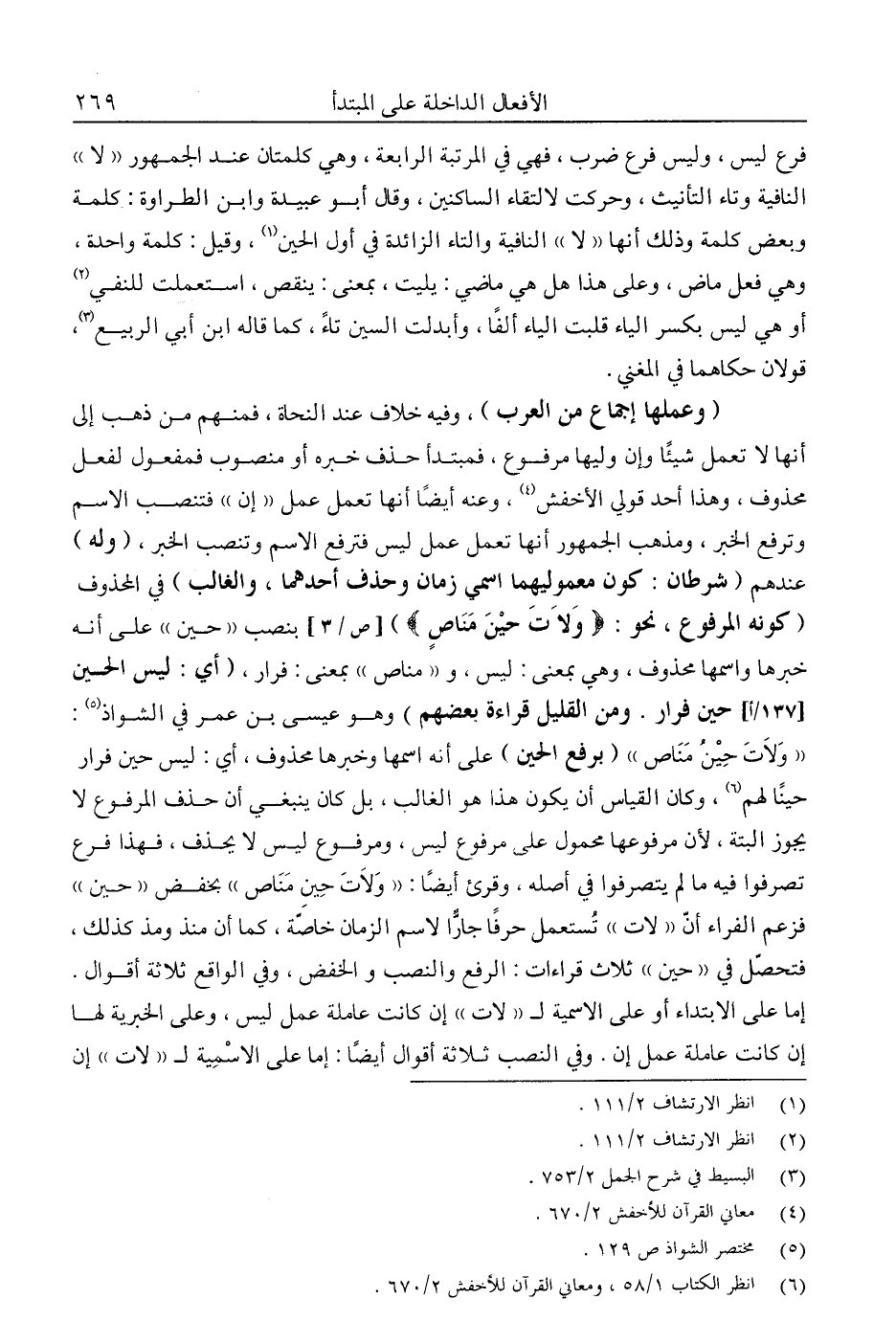 فرع ليس، وليس فرغ ضرب، فهي في المرتبة الرابعة. وهي كلمتان عند الجمهور "لا" النافية وتاء التأنيث. وحركت لالتقاء الساكنين. وقال أبو عبيدة وابن الطراوة: كلمة وبعض كلمة وذلك أنها "لا" النافية والتاء الزائدة في أول الحين1، وقيل: كلمة واحدة، وهي فعل ماض، وعلى هذا هل هي ماضي: يليت، بمعنى ينقص. استعملت للنفي2 أو هي ليس بكسر الياء قلبت الياء ألفًا، وأبدلت السين تاء، كما قاله ابن أبي الربيع3، قولان حكاهما في المغني.