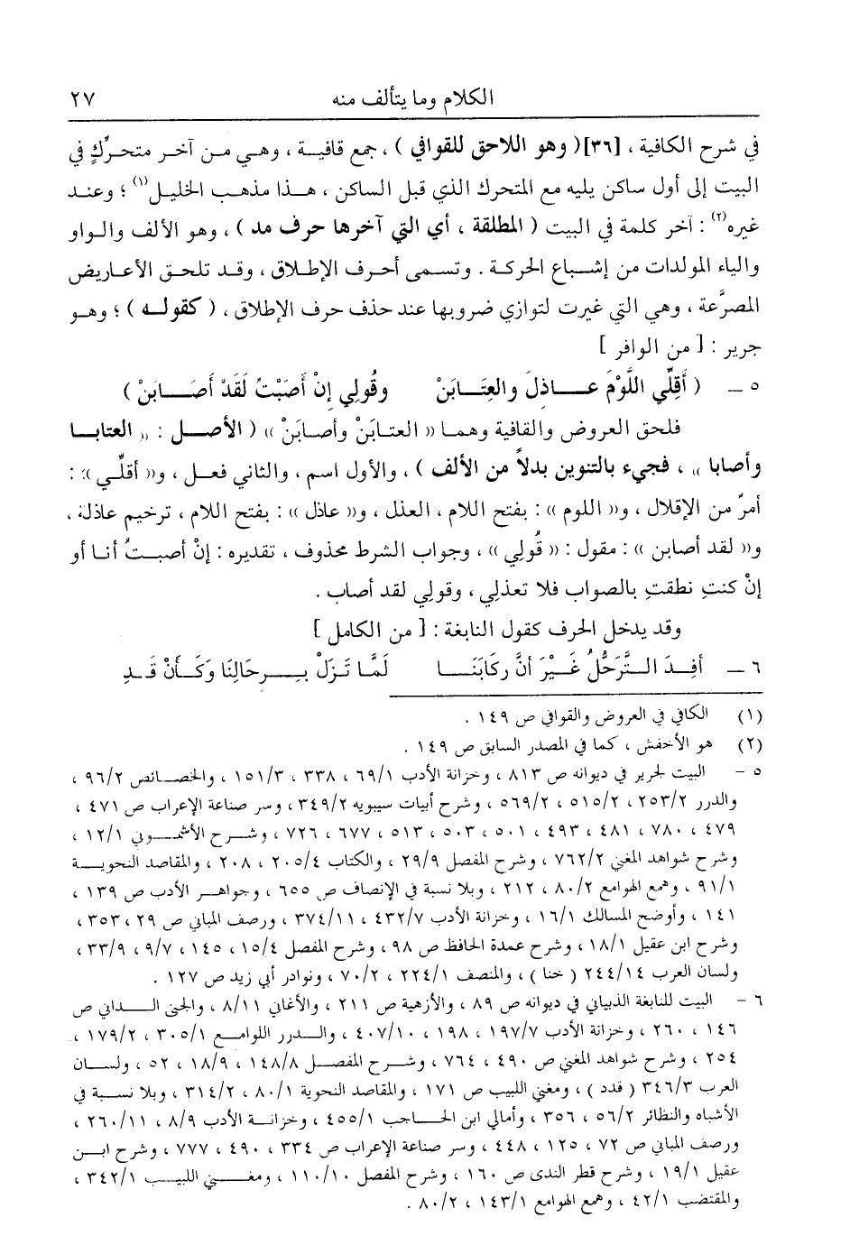 في شرح الكافية، "وهو اللاحق للقوافي". جمع قافية، وهي من آخر متحرك في اليبت إلى أول ساكن يليه مع المتحرك الذي قبل الساكن، هذا مذهب الخليل1؛ وعند غيره2: آخر كلمة في البيت "المطلقة، أي: التي آخرها حرف مد"، وهو الألف والواو والياء المولدات من إشباع الحركة. وتسمى أحرف الإطلاق، وقد تلحق الأعاريض المصرعة، وهي التي غيرت لتوازي ضروبها عند حذف حرف الإطلاق، "كقوله"؛ وهو جرير: [من الوافر]