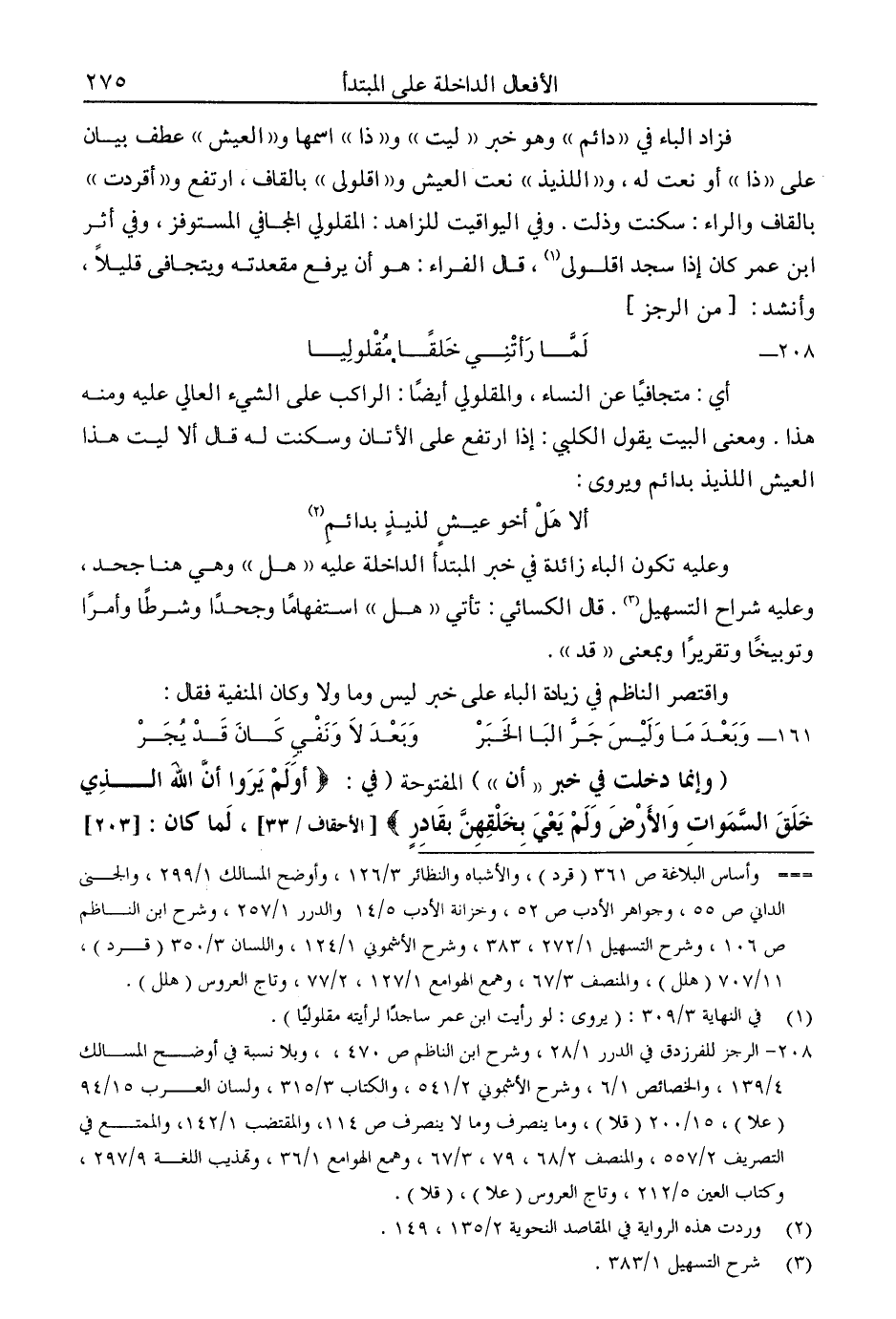 فزاد الباء في "دائم" وهو خبر "ليت" و"ذا" اسمها و"العيش" عطف بيان على "ذا" أو نعت له، و"اللذيذ" نعت العيش و"اقلولى" بالقاف، ارتفع و"أقردت" بالقاف والراء: سكنت وذلت. وفي اليواقيت للزاهد: المقلولي المجافي المستوفز، وفي أثر ابن عمر كان إذا سجد اقلولى1، قال الفراء: هو أن يرفع مقعدته ويتجافى قليلًا، وأنشد: [من الرجز]