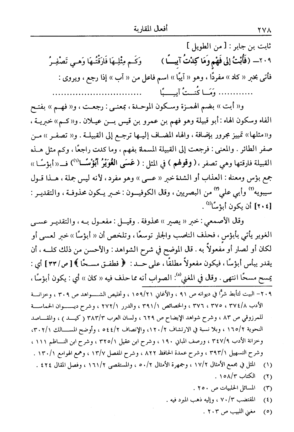 و"أبت" بضم الهمزة وسكون الموحدة، بمعنى: رجعت، و"فهم" بفتح الفاء وسكون الهاء: أبو قبيلة وهو فهم بن عمرو بن قيس بن عيلان. و"كم" خبرية، و"مثلها" تمييز مجرور، بإضافة، والهاء المضاف إليها ترجع إلى القبيلة. و"تصفر" من صفر الطائر. والمعنى: فرجعت إلى القبيلة المسماة بفهم، وما كدت راجعًا، وكم مثل هذه القبيلة فارقتها وهي تصفر. "وقولهم" في المثل: "عسى الغوير أبؤسا1 فـ "أبؤسا" جمع بؤس ومعناه: العذاب أو الشدة خبر "عسى" وهو مفرد؛ لأنه ليس جملة. هذا قول سيبويه2 وأبي علي3 من البصريين، وقال الكوفيون: خبر يكون محذوفة، والتقدير: أن يكون أبؤسًا4.