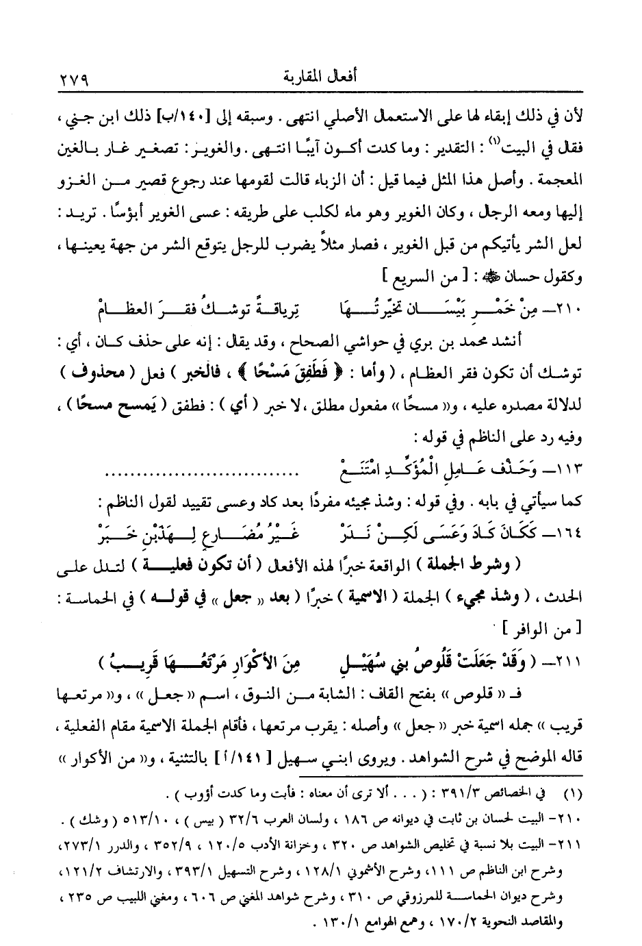 أنشد محمد بن بري في حواشي الصحاح، وقد يقال: إنه على حذف كان، أي: توشك أن تكون فقر العظام، "وأما: {فَطَفِقَ مَسْحًا} ، فالخبر" فعل "محذوف" لدلالة مصدره عليه، و"مسحًا" مفعول مطلق، لا خبر "أي": فطفق "يمسح مسحًا"، وفيه رد على الناظم في قوله: