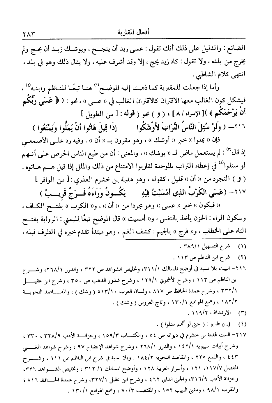 الضائع: والدليل على ذلك أنك تقول: عسى زيد أن ينجح، ويوشك زيد أن يحج ولم يخرج من بلده، ولا تقول: كاد زيد يحج، إلا وقد أشرف عليه، ولا يقال ذلك وهو في بلد، انتهى كلام الشاطبي؟