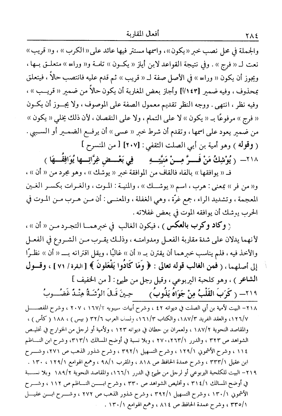 "وكاد وكرب بالعكس"، فيكون الغالب في خبرهما التجرد من "أن"؛ لأنهما يدلان على شدة مقاربة الفعل ومداومته، وذلك يقرب من الشروع في الفعل والأخذ فيه، فلم يناسب خبرهما أن يقترن بـ"أن" غالبًا، ويقل اقترانه بـ"أن" نظرًا إلى أصلهما، "فمن الغالب قوله تعالى: {وَمَا كَادُوا يَفْعَلُونَ} [البقرة: 71] ، وقول الشاعر"، وهو كلحبة اليربوعي، وقيل رجل من طيئ: [من الخفيف]