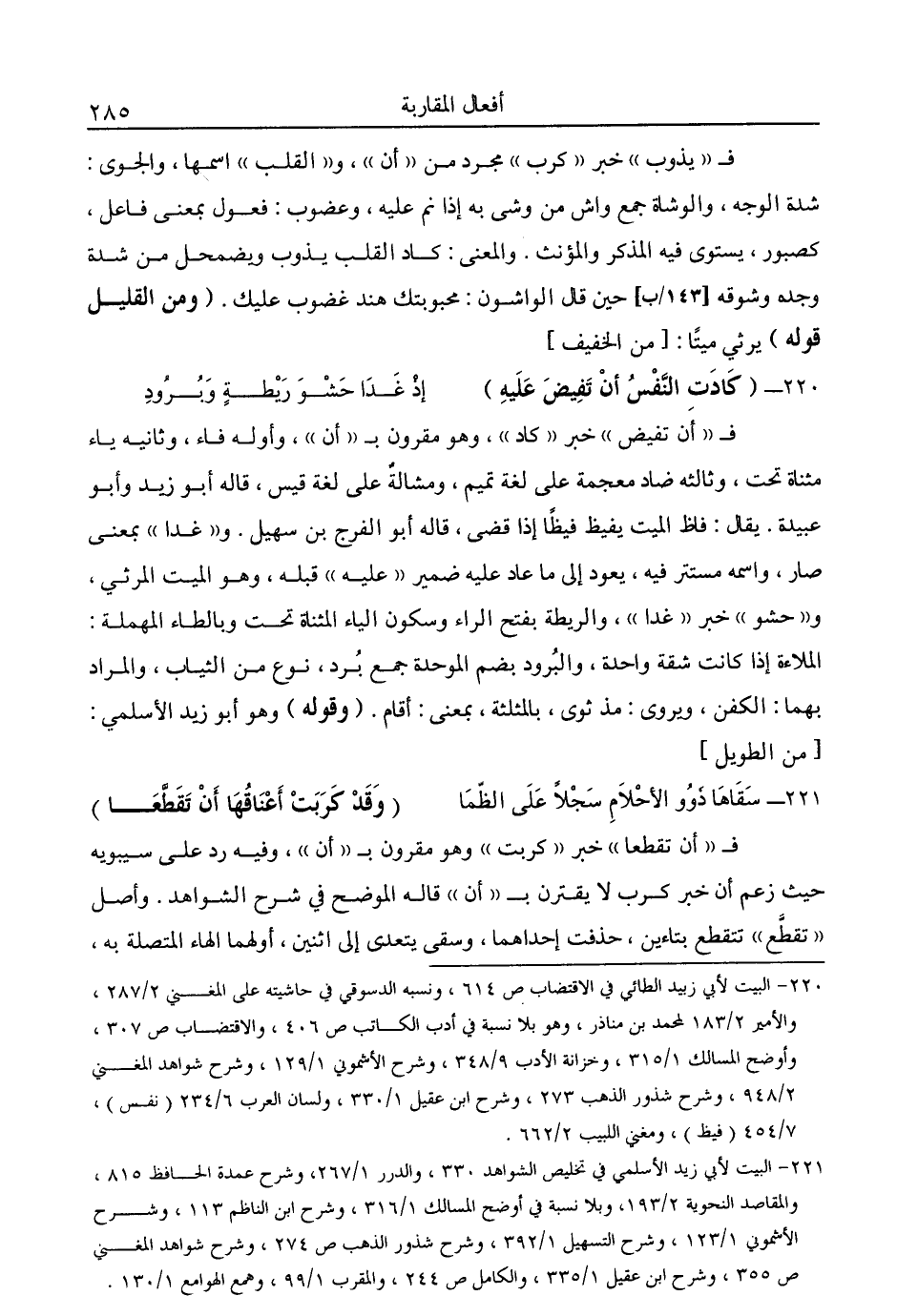 221- البيت لأبي زيد الأسلمي في تخليص الشواهد 330، والدرر 1/ 267، وشرح عمدة الحافظ 815، والمقاصد النحوية 2/ 193، وبلا نسبة في أوضح المسالك 1/ 316، وشرح ابن الناظم 113، وشرح الأشموني 1/ 123، وشرح التسهيل 1/ 392، وشرح شذور الذهب ص274، وشرح شواهد المغني ص355، وشرح ابن عقيل 1/ 335، والكامل ص244، والمقرب 1/ 99، وهمع الهوامع 1/ 130.