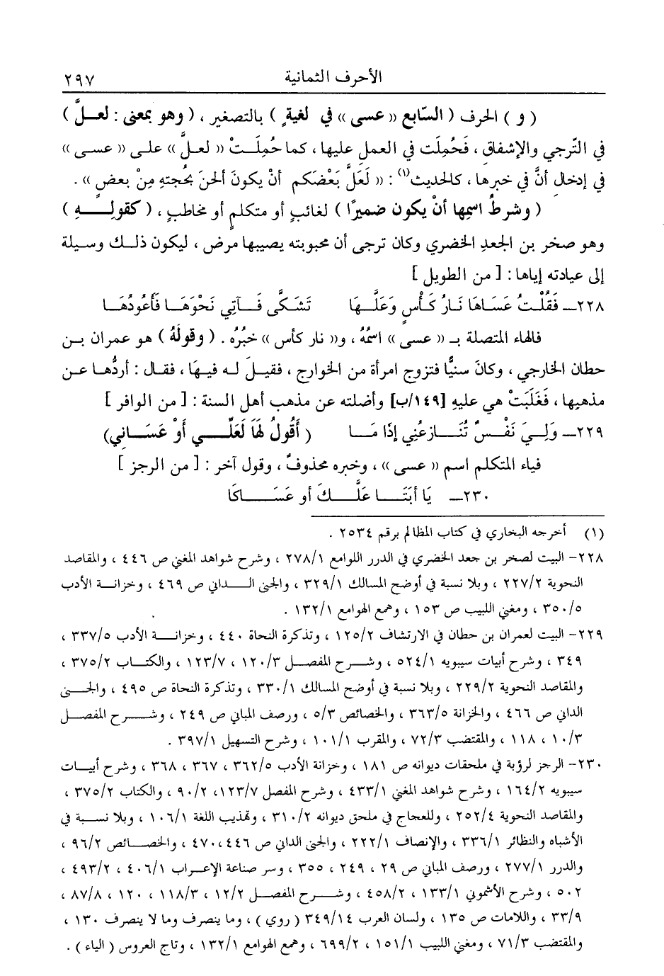 "و" الحرف "السابع "عسى" في لغية" بالتصغير، "وهو بمعنى: لعل" في الترجي والإشفاق، فحملت في العمل عليها، كما حملت "لعل" على "عسى" في إدخال أن في خبرها، كالحديث1: "لعل بعضكم أن يكون ألحن بحجته من بعض".