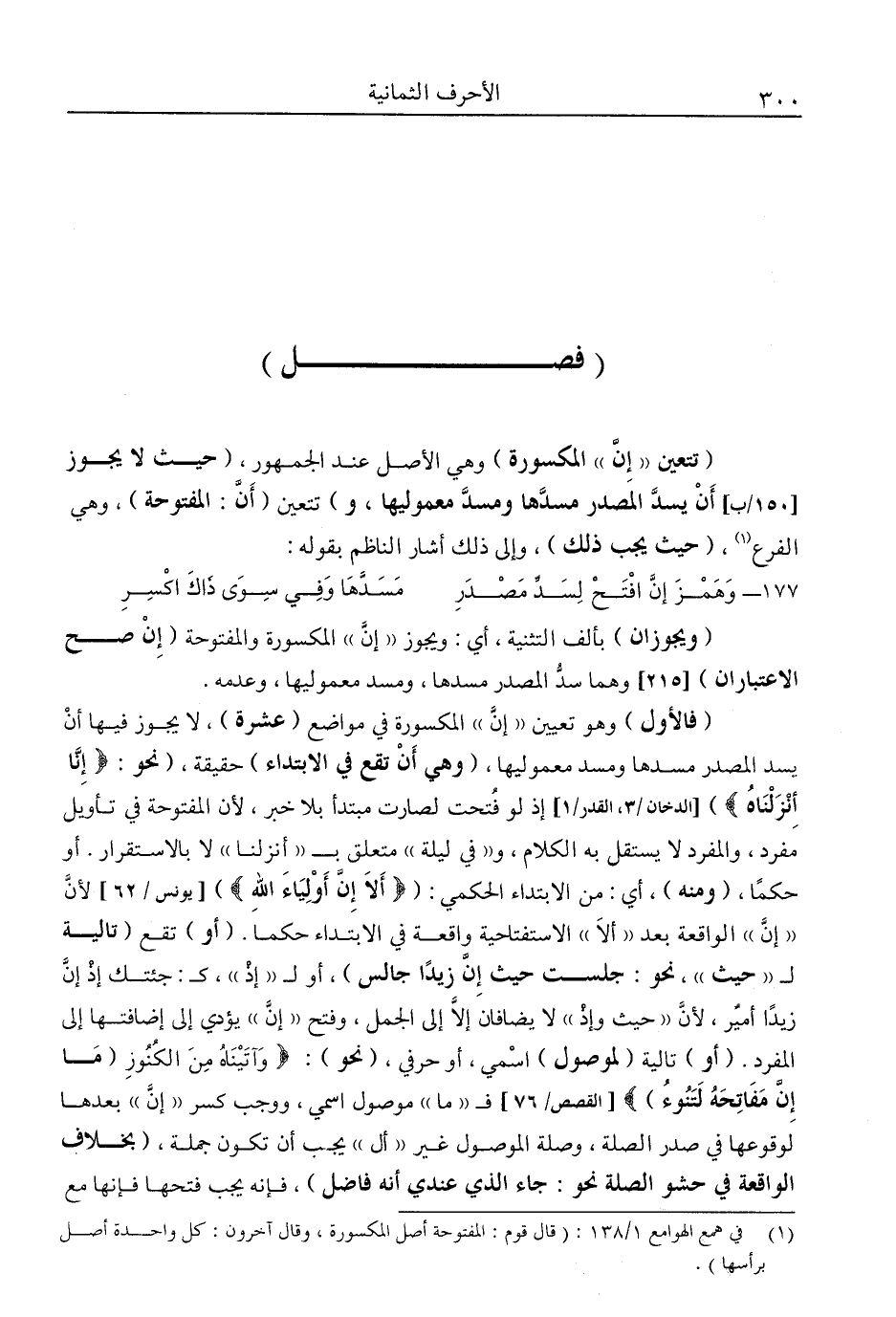 "فالأول" وهو تعيين "إن" المكسورة في مواضع "عشرة"، لا يجوز فيها أن يسد المصدر مسدها ومسد معموليها"، "وهي أن تقع في الابتداء" حقيقة. "نحو: {إِنَّا أَنْزَلْنَاهُ} [الدخان: 3] ، [القدر: 1] ، إذ لو فتحت لصارت مبتدأ بلا خبر؛ لأن المفتوحة في تأويل مفرد, والمفرد لا يستقل به الكلام، و"في ليلة" متعلق بـ"أنزلنا" لا بالاستقرار. أو حكمًا، "ومنه"، أي: من الابتداء الحكمي: {أَلَا إِنَّ أَوْلِيَاءَ اللَّهِ} [يونس: 62] لأن "إن" الواقعة بعد "ألا" الاستفتاحية واقعة في الابتداء حكمًا. "أو" تقع "تالية لـ"حيث"، نحو: جلست حيث إن زيدًا جالس", أو لـ"إذ"، كـ: جئتك إذ إن زيدًا أمي؛ لأن "حيث وإذ" لا يضافان إلا إلى الجمل. وفتح "إن" يؤدي إلى إضافتها إلى المفرد. "أو" تالية "لموصول" اسمي، أو حرفي، "نحو": {وَآتَيْنَاهُ مِنَ الْكُنُوزِ مَا إِنَّ مَفَاتِحَهُ لَتَنُوءُ} [القصص: 76] فـ"ما" موصول اسمي, ووجب كسر "إن" بعدها لوقوعها في صدر الصلة، وصلة الموصول غير "أل" يجب أن تكون جملة، "بخلاف الواقعة في حشو الصلة نحو: جاء الذي عندي أنه فاضل"، فإنه يجب فتحها فإنها مع