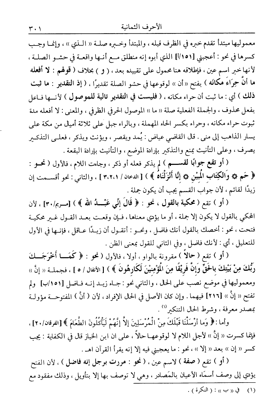 "أو" تقع "محكية بالقول، نحو: {قَالَ إِنِّي عَبْدُ اللَّهِ} [مريم: 30] ؛ لأن المحكي بالقول لا يكون إلا جملة. أو ما يؤدي معناها، فإن وقعت بعد القول غير محكية فتحت، نحو: أخصك بالقول أنك فاضل، ونحو: أتقول أن زيدًا عاقل، فإنها في الأول للتعليل، أي: لأنك فاضل، وفي الثاني للقول بمعنى الظن.