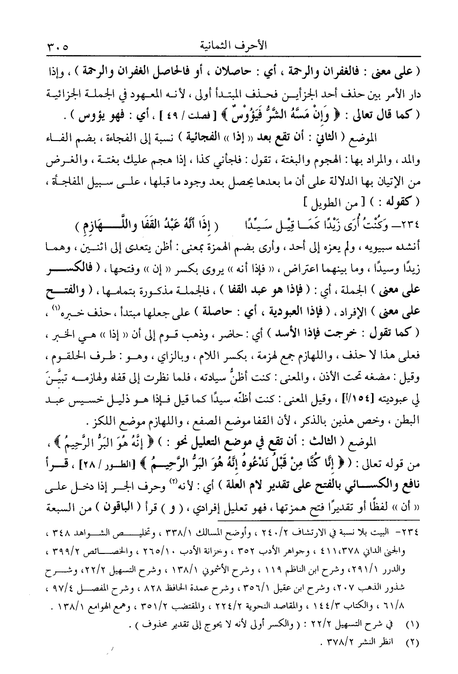 الموضع "الثالث: أن تقع في موضع التعليل نحو:" {إِنَّهُ هُوَ الْبَرُّ الرَّحِيمُ} ، من قوله تعالى: {إِنَّا كُنَّا مِنْ قَبْلُ نَدْعُوهُ إِنَّهُ هُوَ الْبَرُّ الرَّحِيمُ} [الطور: 28] ، قرأ نافع والكسائي بالفتح على تقدير لام العلة" أي: لأنه2 وحرف الجر إذا دخل على "أن" لفظًا أو تقديرًا فتح همزتها، فهو تعليل إفرادي، "و" قرأ "الباقون" من السبعة